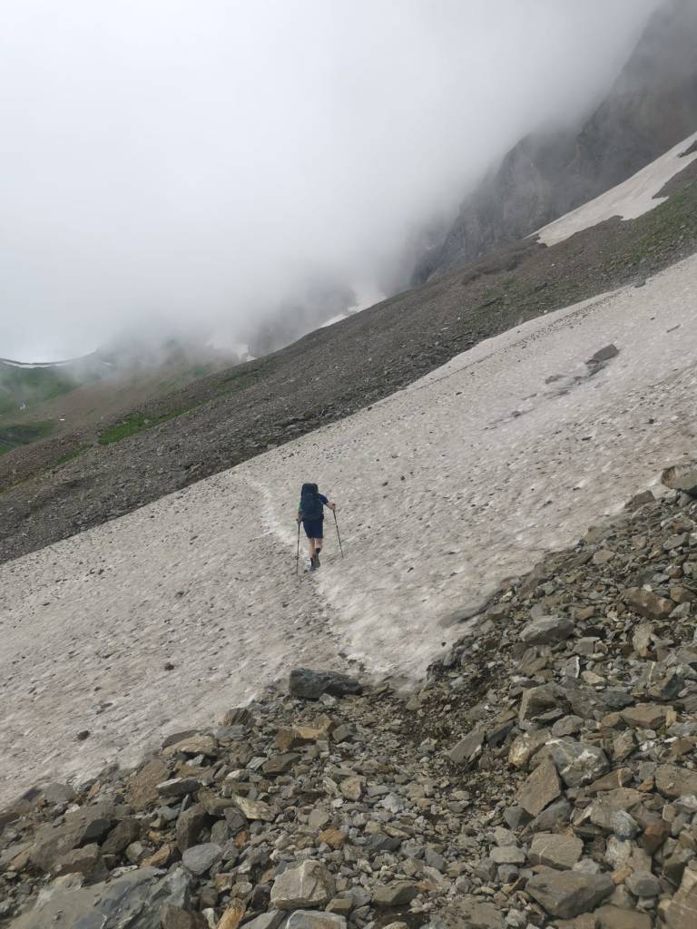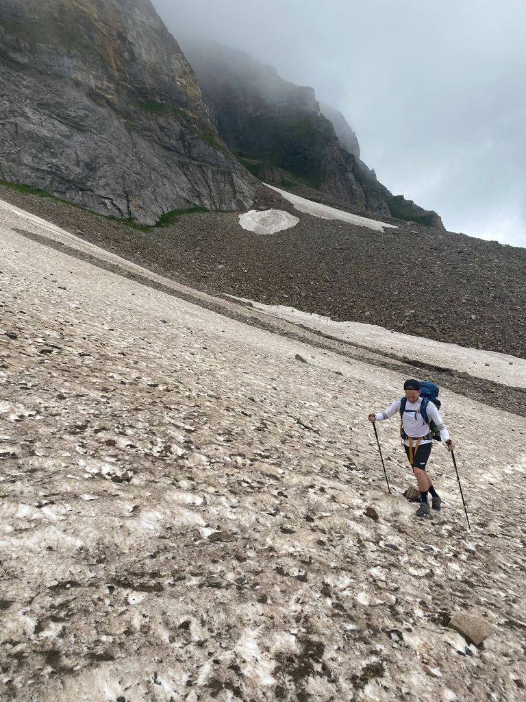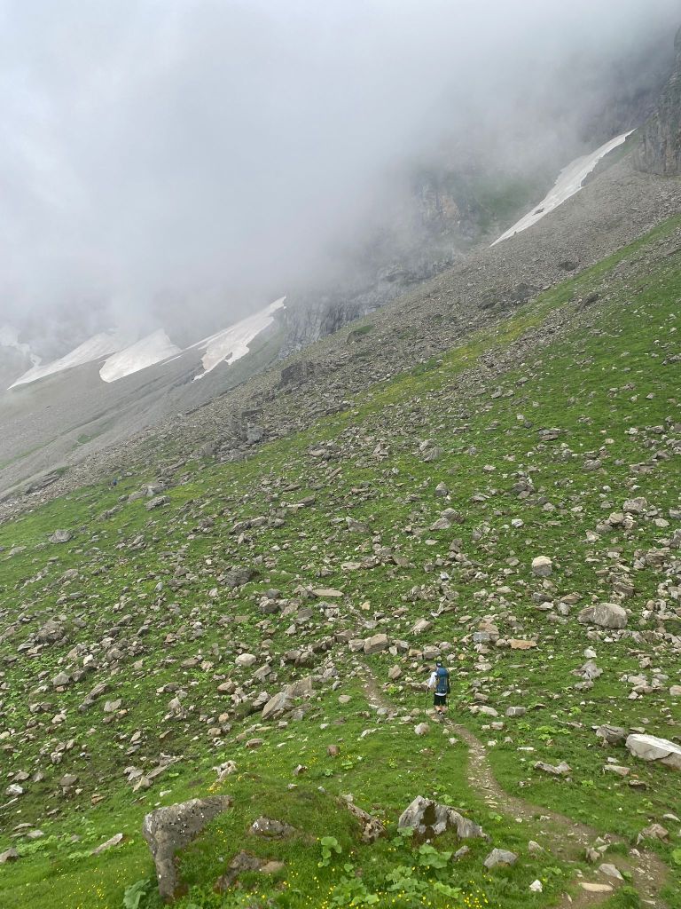 Mittlerweile sind wir schon 5 Tage am Stück gewandert und haben jeden Tag viele Kilometer und Höhenmeter zurückgelegt. Trotz Schmerzen und somit stark erschwerten Bedingungen halten wir weiterhin an unserem Ziel fest. Aber wir sind bereit, Kompromisse einzugehen. So haben wir heute einen steilen Ausstieg ausgelassen, konnten aber die übrige Etappe gemäss Originalroute in einer tollen Zeit zurücklegen und somit wiederum frühzeitig in die Erholungsphase übergehen.