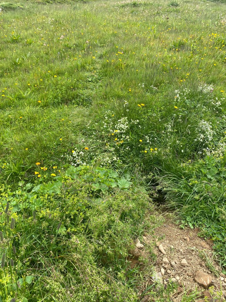 Frisch gestärkt nahmen wir den weiteren Abstieg in Angriff und das ging alles sehr reibungslos von statten. Da entdeckte Haude plötzlich einen braunen Fleck in der grünen Landschaft und wies Fourchi darauf hin, dass es sich um einen Murmeli handeln könnte. Und tatsächlich, der braune Fleck bewegte sich und wir verfolgten die Spur noch ein Stück. Haude sah, wie das Murmeli hinter einem Strauch verschwand und da entdeckte er dann wohl auch noch das Nest. Leider hat es für ein Foto vom Murmeli nicht gereicht, aber Haudes Effort können wir zeigen (und den Beweis vom Loch mit dem Nest).
