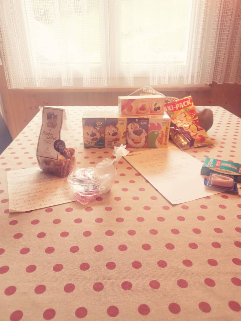 Auf dem Tisch waren aber noch mehr Sachen und hier möchten wir auch noch Fourchis Schwester erwähnen. Am Montagabend haben wir ihr eine Liste geschickt mit Dingen, welche wir in dieser Unterkunft in Engelberg noch brauchen könnten:
