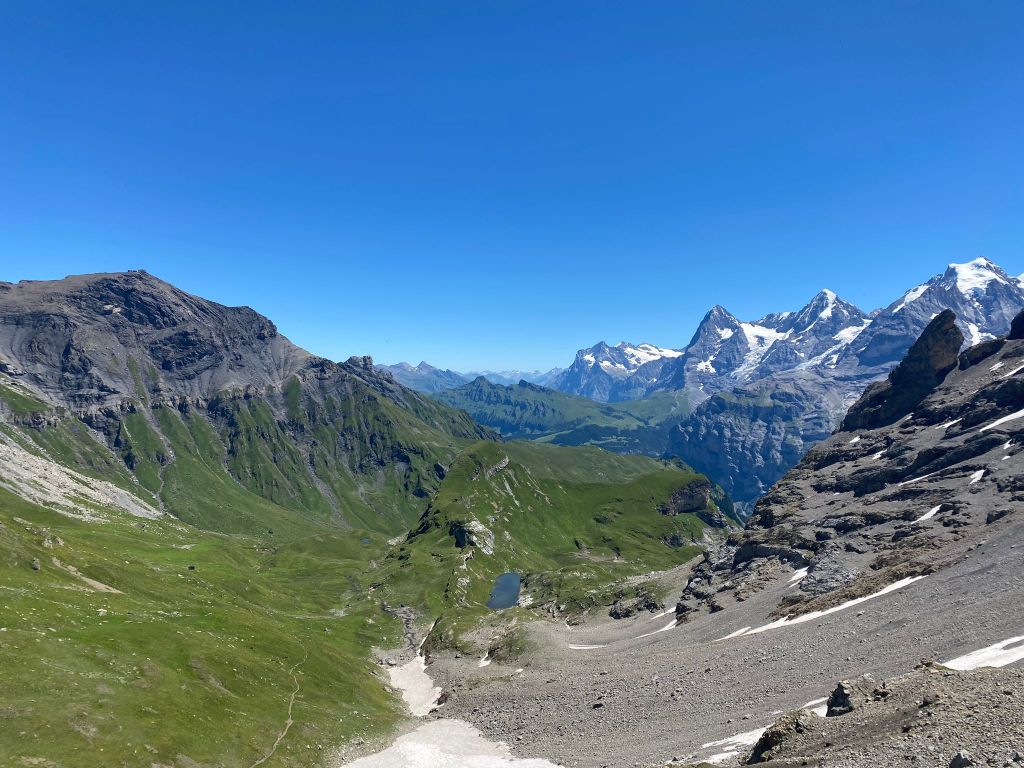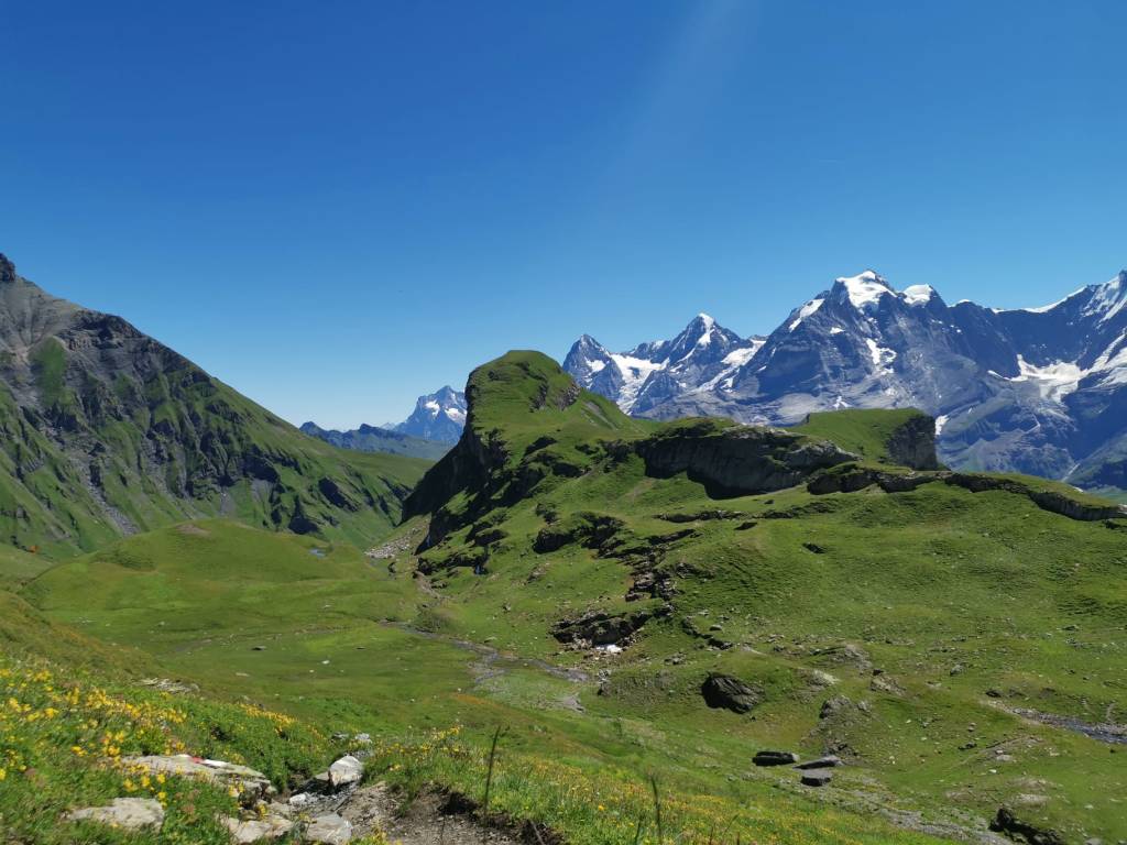 Haude ist zwar auf dem Bild nicht zu sehen, aber er sah ziemlich ähnlich aus der Wäsche. Jedenfalls sind wir dann um 09.00 Uhr in Mürren angekommen und konnten uns langsam aber sicher von den vielen Menschen lösen. Zuerst durchquerten wir noch ganze Dorf, welches auf uns auch sehr schön wirkte und auf jeden Fall einen Besuch wert wäre. Danach ging es langsam bergauf und da merkte man schon, wie wir viele Menschen überholen und dann hinter uns lassen konnten. Irgendwann sind wir dann wieder in unserer „gewohnten“ Umgebung angekommen und konnten grossen Schrittes Kurs Richtung Sefinenfurgge nehmen.
