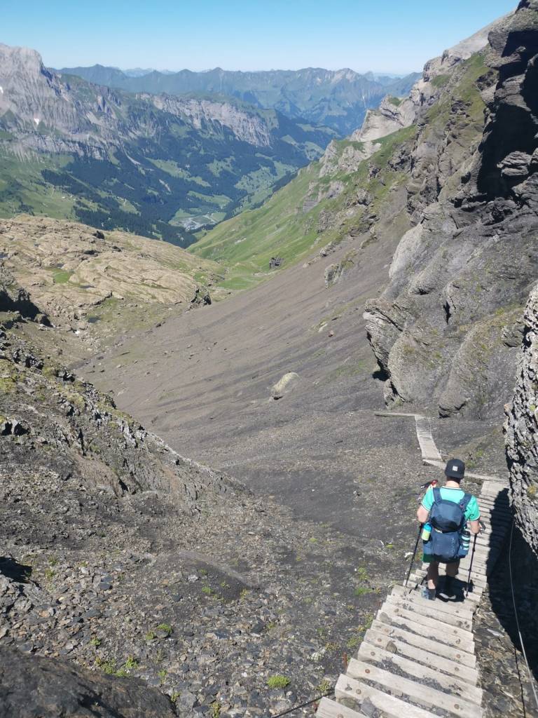 Wir kamen beide wohlbehalten runter und danach folgten etwas breitere steinige Wege, um auch noch die weiteren Höhenmeter bis auf die Griesalp hinuntersteigen zu können. Unsere Körper waren aber wirklich immer wieder am Limit und so half es uns extrem, dass wir zu zweit unterwegs waren. Einem von uns geht es immer noch ein Spürchen besser und indem dieser voranschreitet, kann er den schwächelnden Part mitziehen. Aber es ist klar, nach der gestrigen Etappe hatten wir heute wirklich sehr mit den Kräften zu kämpfen.