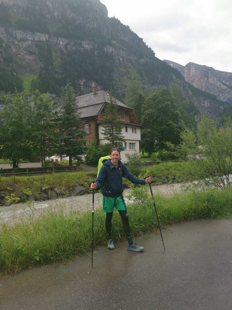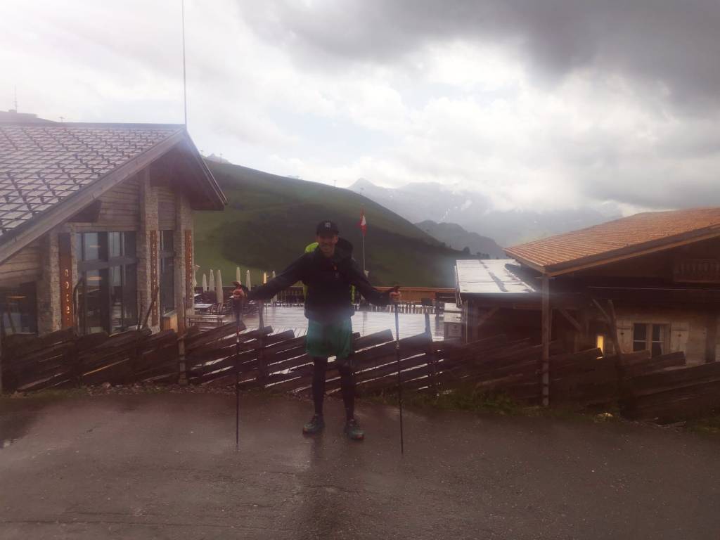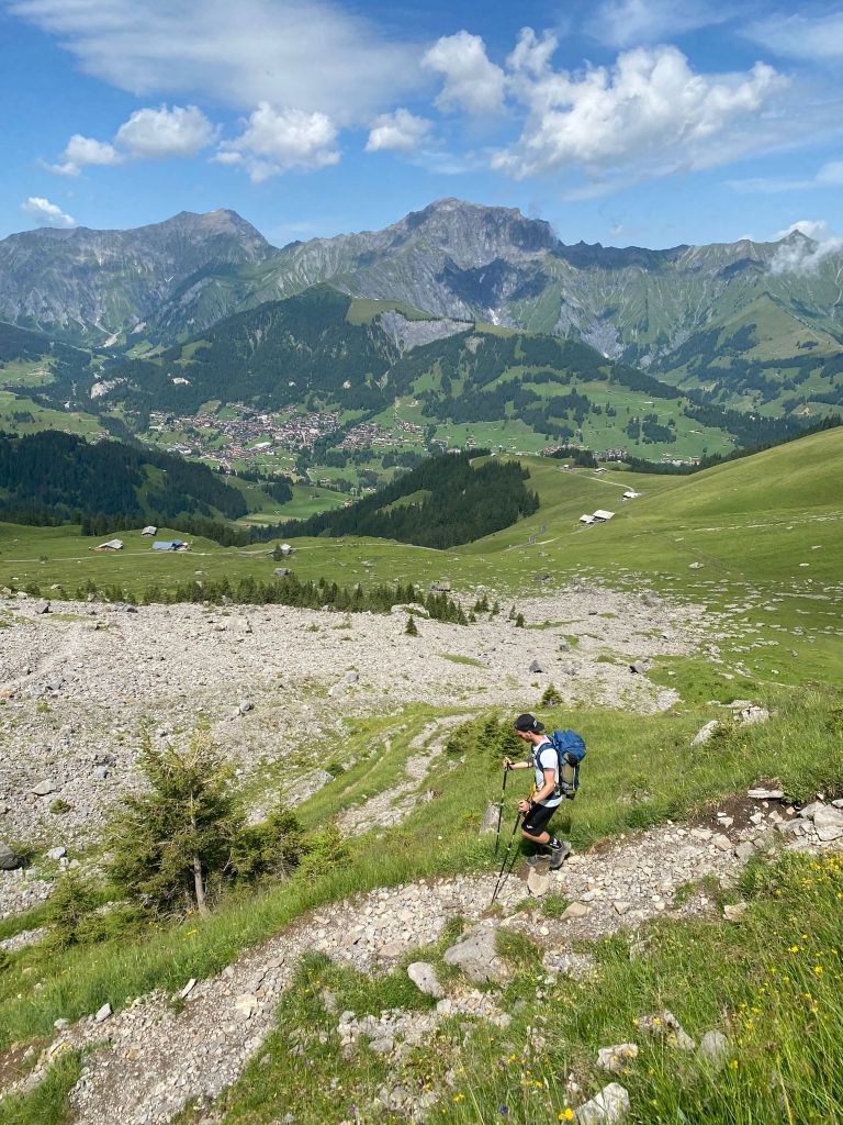Nach ungefähr einer halben Stunde im Trockenen entschieden wir uns dann die Sachen wieder zu packen und den letzten Abstieg nach Lenk in Angriff zu nehmen. Da zu dieser Zeit gerade nochmals so ein richtig heftiger Schauer einsetzte, warteten wir dann aber doch noch 5 weitere Minuten im Trockenen und dann gings los. Tatsächlich schien es, als ob wir ein Fenster ohne Regen erwischt haben. Kaum hat Haude das gesagt, begann es 5 Minuten später wieder zu regnen… Danke Haude. Aber es war nicht so schlimm, wie noch beim Aufstieg. Ein paar wenige Regentropfen, die gar nicht weiter störten. Und so setzten wir in unserer Euphorie wieder zum Laufschritt an und stürzten uns die ersten 300 Höhenmeter auf einer Strecke von knapp 2 Kilometern im Stile von Trailrunnern herunter.