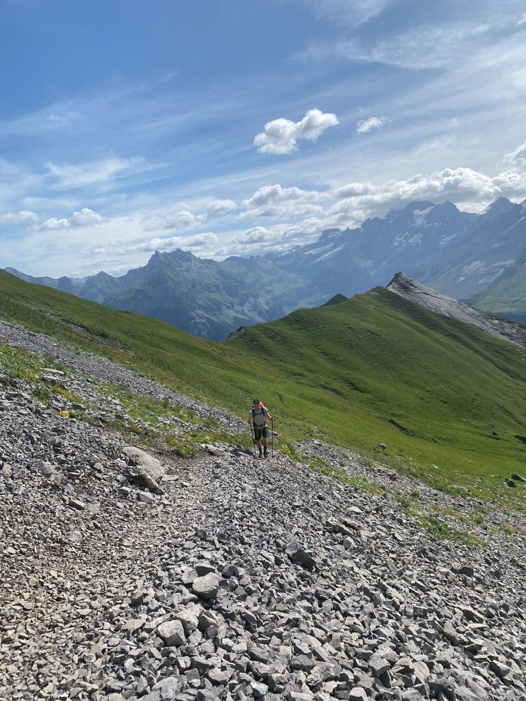 Einige Minuten später trafen wir dann erneut auf zwei Wanderer, welche wir vor dem letzten Aufstieg überholt hatten. Oben auf der Bunderchrinde hatten wir dann kurz Zeit, uns mit ihnen auszutauschen. Sie erwähnten, dass sie bereits vor einem Jahr mit der Via Alpina in Vaduz gestartet hätten, dann aber in der Griesalp wegen Kniebeschwerden abbrechen mussten. Nachdem sie die Etappe von Griesalp nach Kandersteg in der Zwischenzeit noch separat absolviert hatten, wollten sie jetzt noch den gesamten Rest ab Kandersteg absolvieren. Sie waren aber mit einem Zelt unterwegs und durften somit einige Kilos mehr Gepäck tragen als wir. Nach diesem kurzen Gespräch haben wir uns verabschiedet und wir hoffen natürlich, dass sie in den nächsten Tagen auch bis nach Montreux durchziehen können.