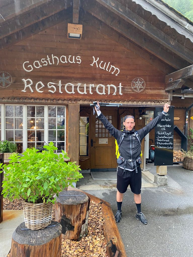 Euch geht es jetzt vermutlich genau wie uns an dieser Stelle – wann kommen wir endlich in Brünig an? Wir verzichten auf weitere Räubergeschichten auf diesem Weg und kommen nun zum triumphalen Einmarsch in Brünig: Um 18.10 Uhr war es so weit und wenige Minuten später konnten wir dann bei unserer Unterkunft Gasthaus Brünig Kulm endlich einchecken – halt einfach pflotschnass, weil es nochmals so richtig geregnet hat.
