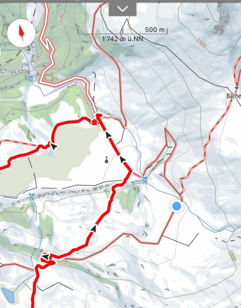 Nach einer gefühlten Ewigkeit erreichten wir dann doch noch das Sachsler Seefeld, welches bei schönem Wetter wohl wahnsinnig schön wäre. Uns beeindruckte das nicht sonderlich und so ging es für uns immer weiter, die Älggialp liess nämlich auf sich warten. Als wir dann vor der Entscheidung standen, den Bergwanderweg oder den Wanderweg einzuschlagen, ging es über den Wanderweg weiter – Fourchi hat entschieden. Etwas später hat Haude dann doch nochmals auf seiner App geschaut und gesehen, dass wir da auf einem ordentlichen Umweg unterwegs waren (der blaue Punkt sind wir).