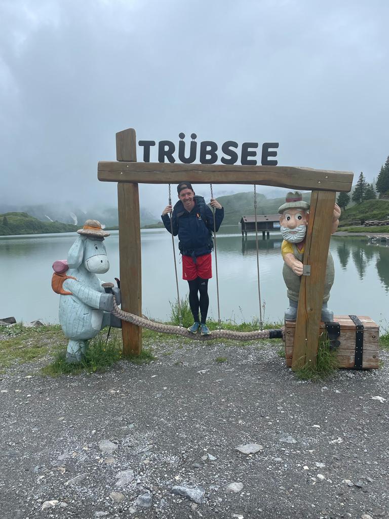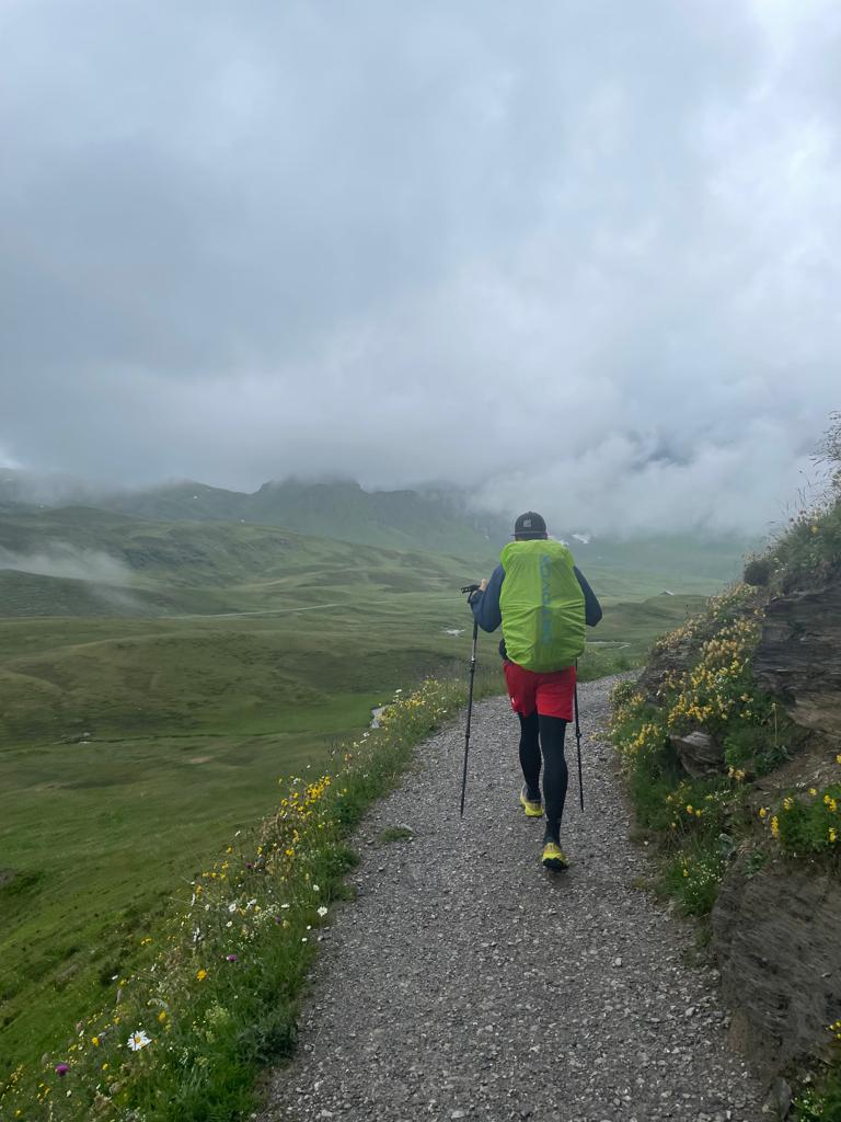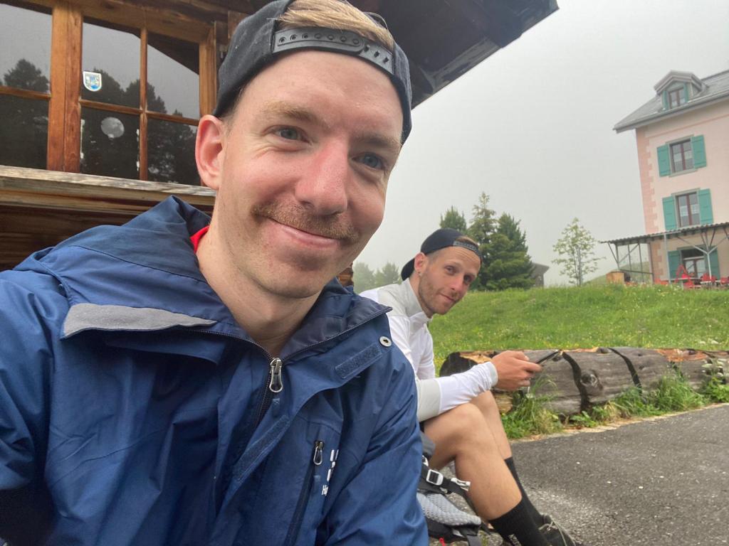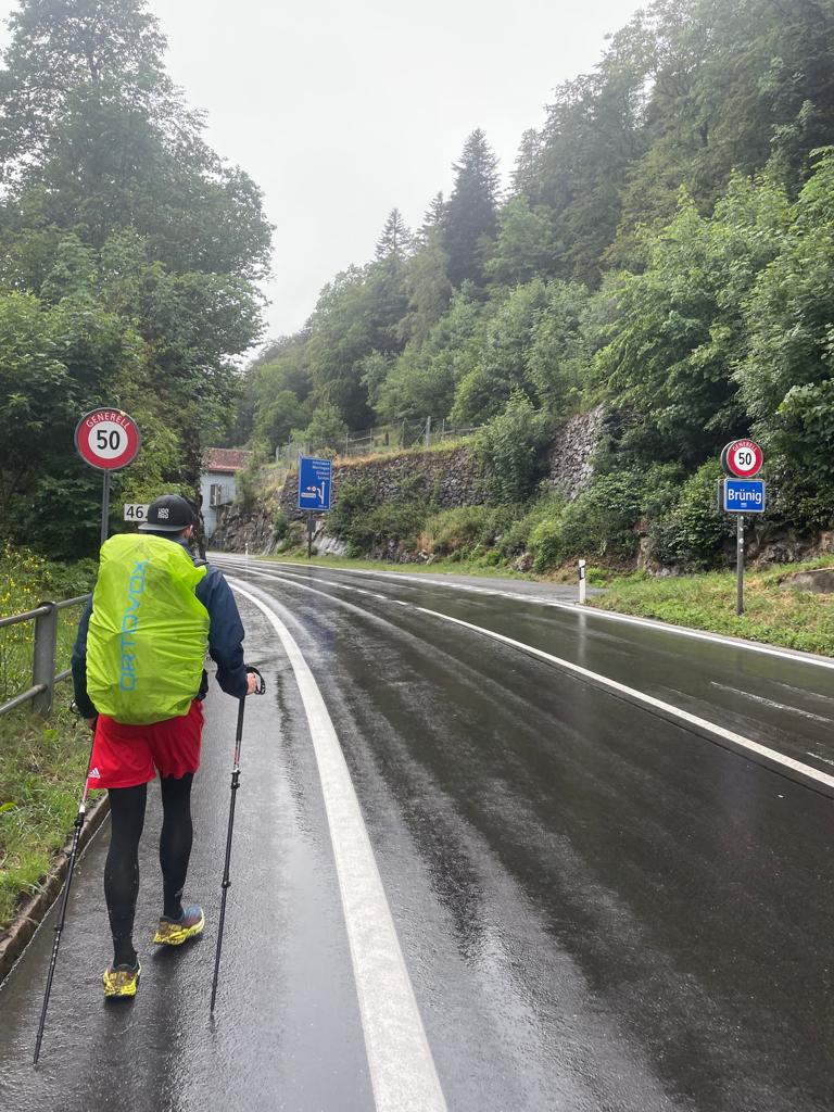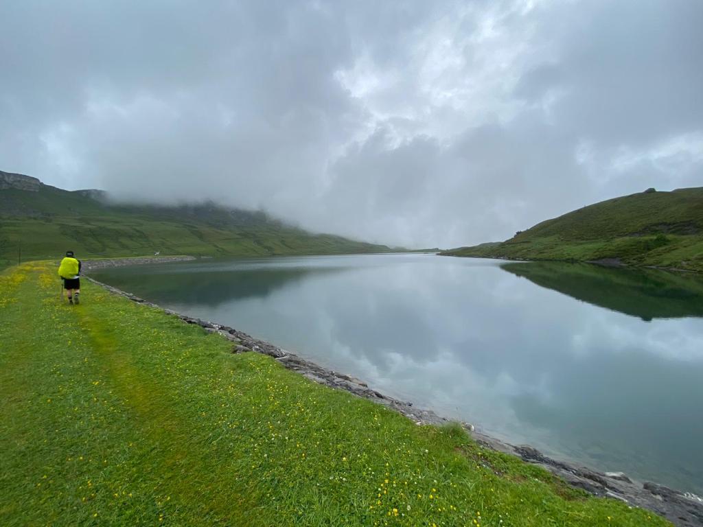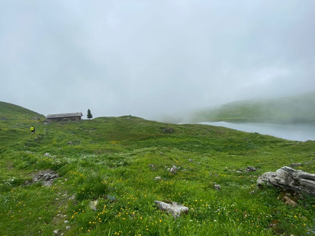 Alles wieder tiptop, zusätzlich haben wir beide unseren Rucksack in die Hülle gepackt und machten uns auf in Richtung Tannalp. Da setzte dann erstmals etwas stärkerer Regen ein, weshalb sich Fourchi dann auch noch entschied, seine Regenjacke überzuziehen – das Tenü würde fortan bis zum Ende der Etappe nicht mehr verändert werden. Unbeirrt legten wir einen Kilometer nach dem anderen zurück, hin und wieder mit einer kleinen Steigung, aber im Wesentlichen doch eher flach und über breite Wanderwege. Nach insgesamt 02.15 Stunden Laufzeit sind wir dann auch schon auf der Tannalp angekommen – die Pace stimmte und wir waren zufrieden mit dem bisherigen Verlauf der Etappe. Leider verpasste es Haude danach die letzte Fahrgelegenheit noch zu erwischen und so blieb uns nichts anders übrig, als ein weiteres Mal um den Tannensee zu watscheln (das war schon so vorgesehen, aber der Zug ist wirklich vor unserer Nase losgefahren).