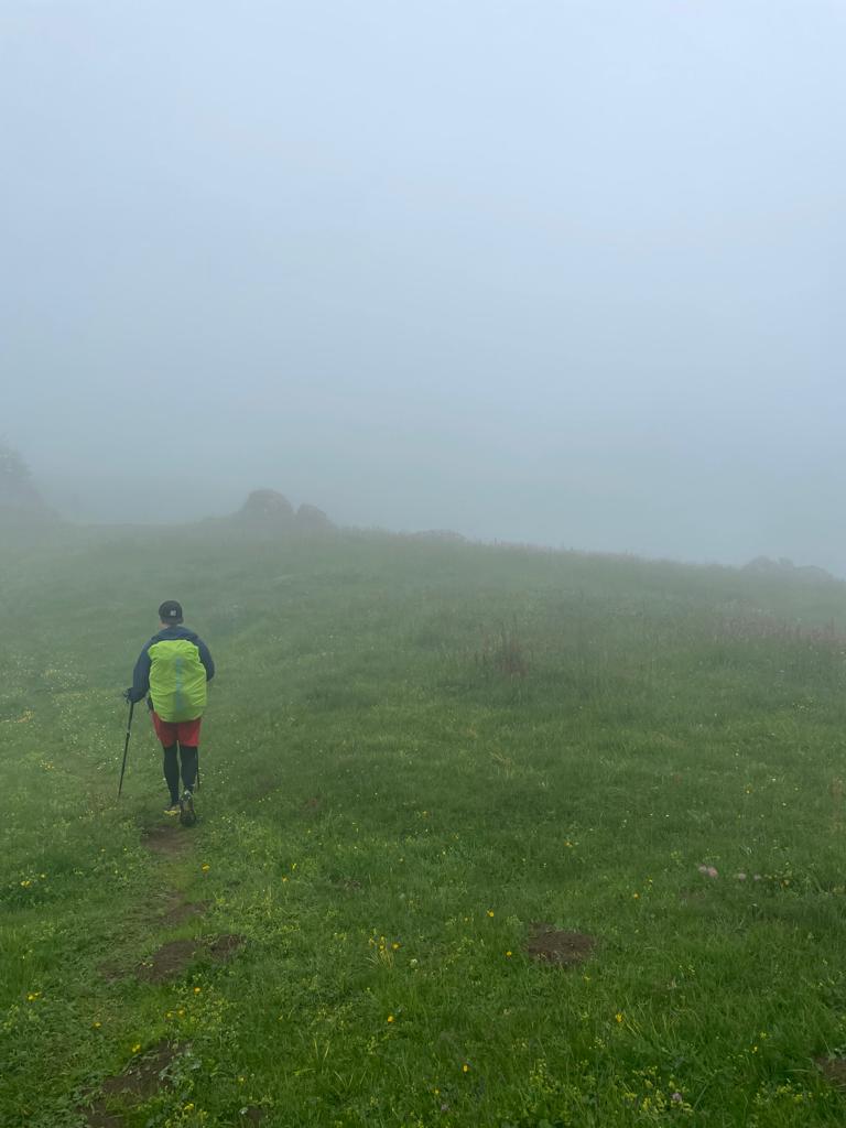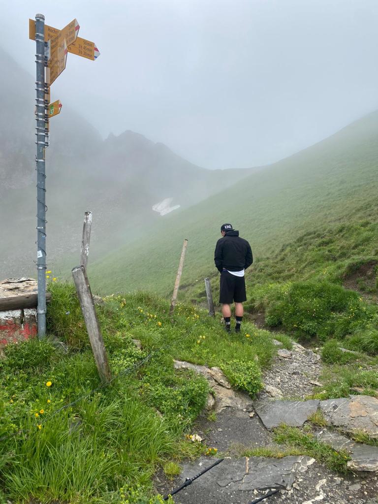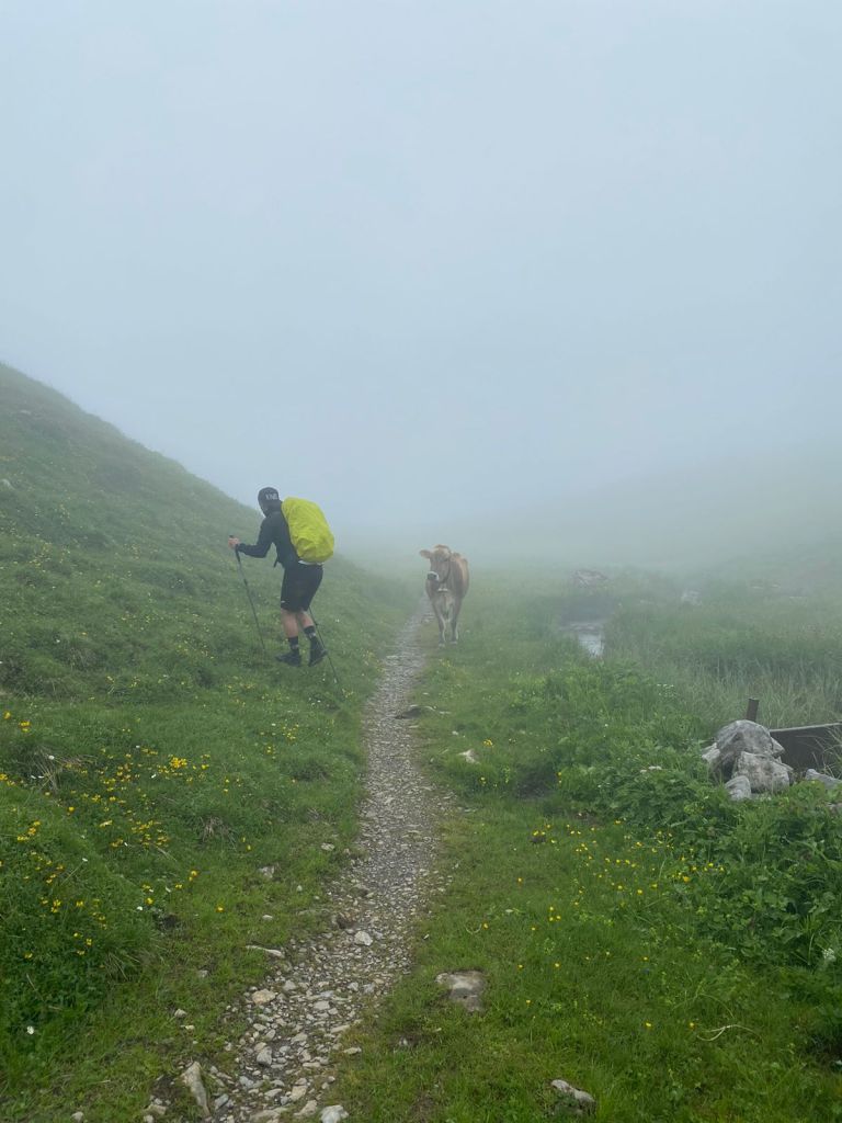 Natürlich durfte auch die obligatorische Begegnung mit einer Kuh auf dem Wanderweg nicht fehlen. Fourchi weicht da souverän aus, auch wenn es auf der Wiese eben auch ordentlich rutschig war. Generell mussten wir zu diesem Zeitpunkt eingestehen, dass der Regen jetzt definitiv die Abstiege sehr stark negativ beeinträchtigte. Ob grosse Steine, Dreck, Wiese oder nasse Wurzeln – alles war rutschig. Und übrigens sahen wir auch nicht besonders weit, hauptsächlich Nebel und so.