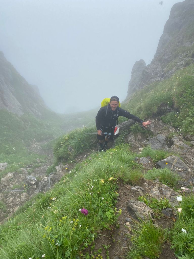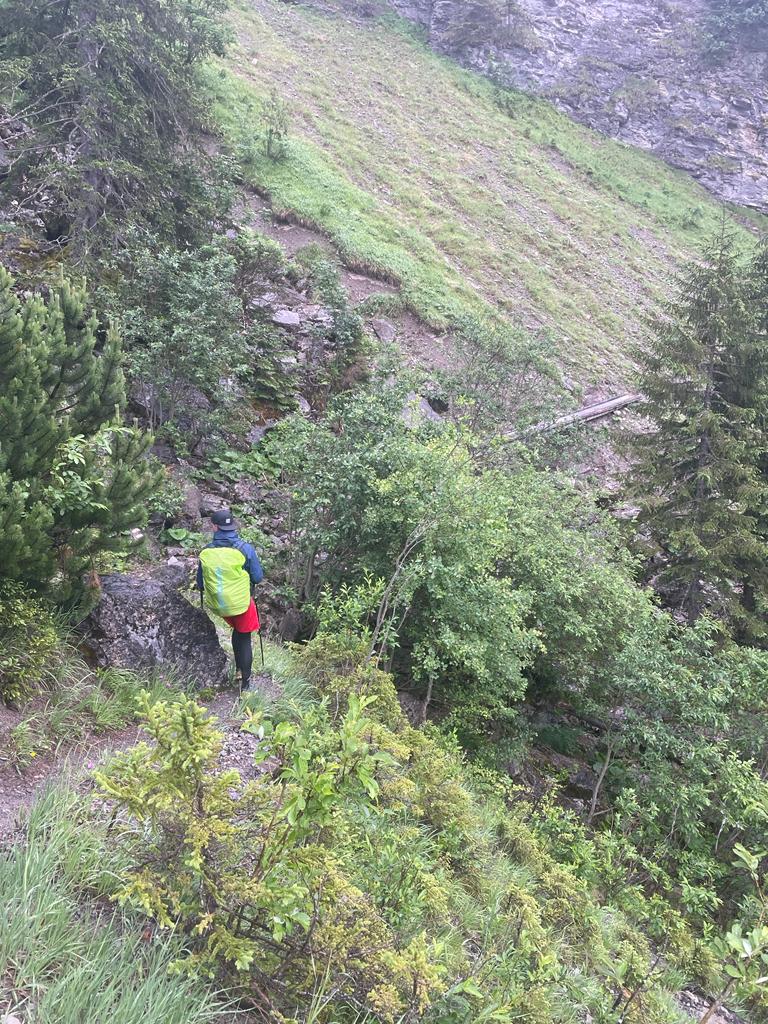 Nun stand uns also ein Abstieg nach Älggialp bevor, und zunächst war das alles ziemlich easy. Wir liefen über schmale Wege und von der Seite hingen jeweils Gräser und sonstiges Grünzeug in den Weg hinein. Wenn wir also da durchliefen, liessen sie all das aufgesetzte Wasser direkt an unsere Beine, über unsere Socken in unsere Schuhe plätschern. Es gibt wirklich schönere Gefühle – zumal wir noch mindestens 5 Stunden so weiterwandern mussten. Naja, gab’s halt mal ein bisschen nasse Füsse, aber es würde noch schlimmer kommen. Plötzlich ging es nicht mehr so leicht abfällig weiter, sondern es folgte eine steile Kraxelpassage. Es war nicht gerade förderlich, dass auch die Ketten, die Eisentritte und sowieso alles nass war. Entsprechend gingen wir da mit äusserster Vorsicht zu Werke, um da irgendwie wohlbekommen unten anzukommen. Diese Passage kostete uns ca. 15 Minuten, viele Meter haben wir dabei aber nicht wirklich zurückgelegt.