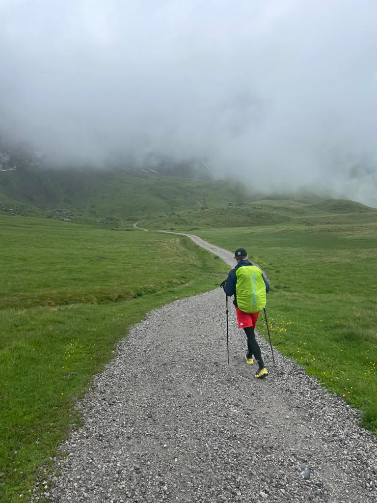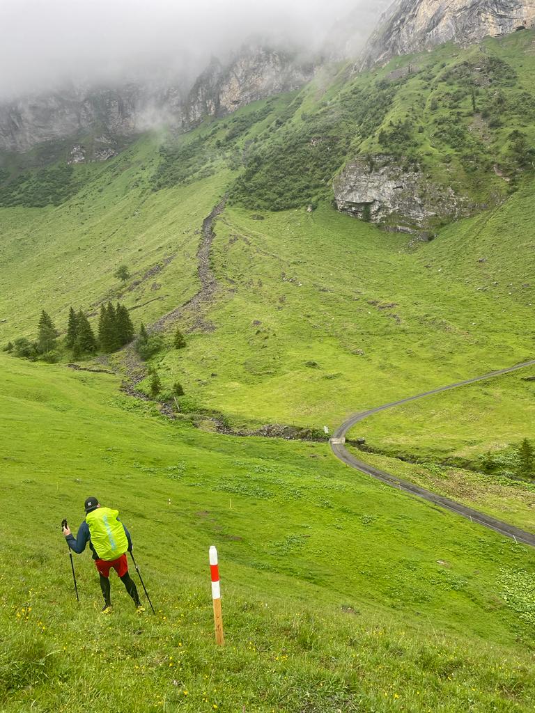 Übrigens gab es noch einen letzten kleinen Aufstieg von gegen 200 Höhenmetern zurückzulegen. Da ging es sehr regelmässig bergauf und mit unserer Pace konnten wir da schon sehr viel Zeit gutmachen. Oben angekommen startete für uns dann der viel ungemütlichere Teil, weil wir noch über 700 Höhenmeter bis Brünig absteigen mussten. Und hin und wieder fanden wir wirklich keinen Weg mehr über die Wiesen. Stattdessen kämpften wir uns irgendwie von Markierung zu Markierung – oder wie Fourchi neben den matschigen Wegen hindurch.
