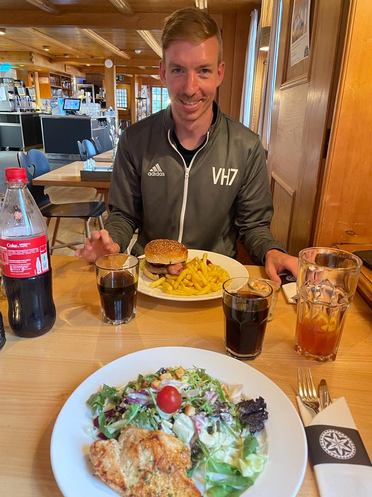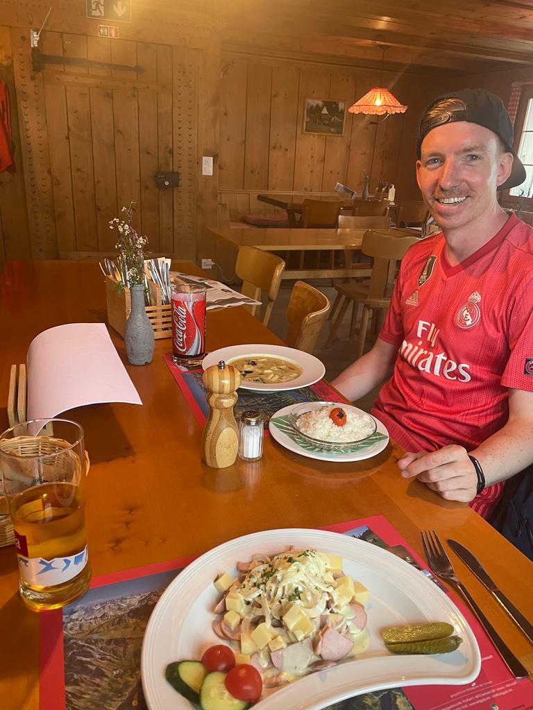 Wir nahmen es natürlich sportlich, diese paar Kilometer spielten definitiv auch keine Rolle mehr und immerhin war der Weg flach und breit. Nach 05.45 Stunden Laufzeit sind wir dann gegen 14.00 Uhr in der Älggialp eingetroffen und da gingen wir zielstrebig direkt ins Restaurant hinein. Natürlich waren wir auch hier wieder die Einzigen, aber wir wurden deshalb sehr schnell und wahnsinnig freundlich bedient. Und jetzt alle festhalten – Fourchi hat sich nicht nur ein 0.5l Rivella bestellt, sondern auch noch einen ganzen Wurst-Käse-Salat – Wahnsinn und ein absolutes Novum. Haude glänzte aber auch – neben seiner 0.5l Cola bestellte er sich ein Curry, in einer Alphütte… Das Essen kam auch schon wenig später und wir waren echt total zufrieden.