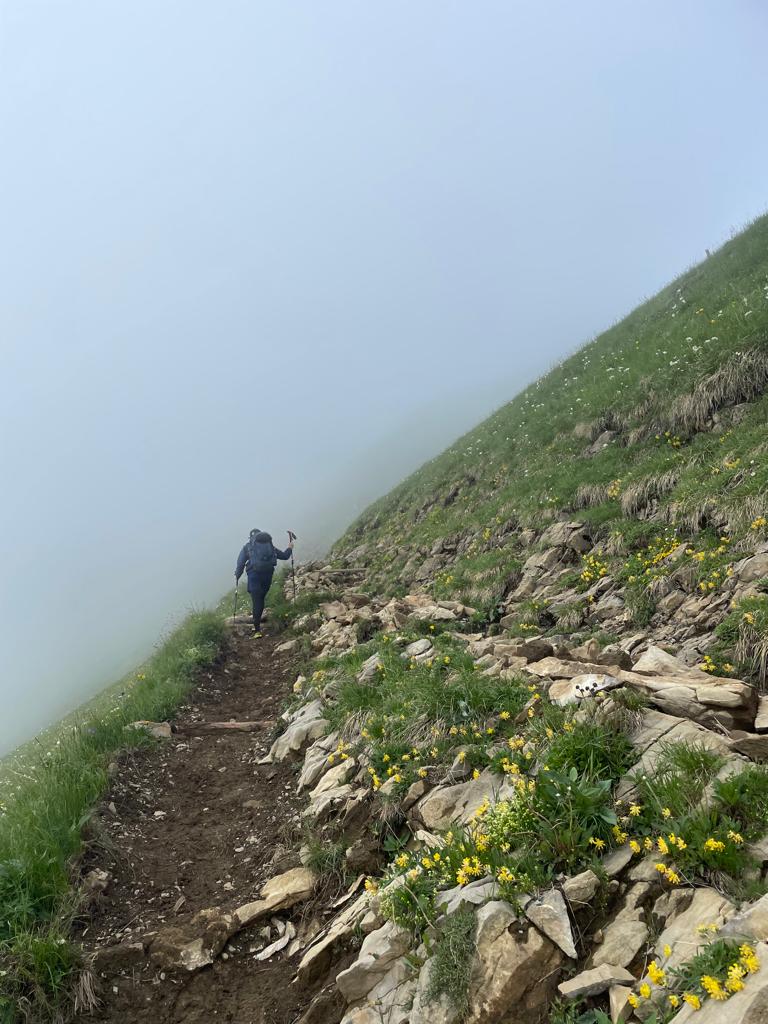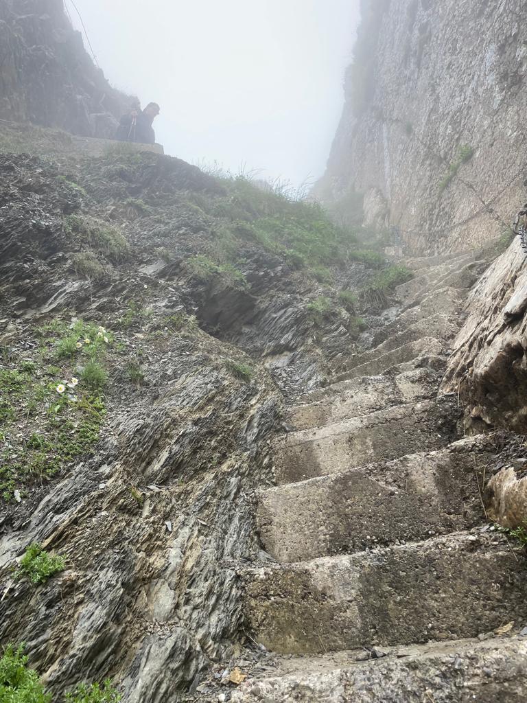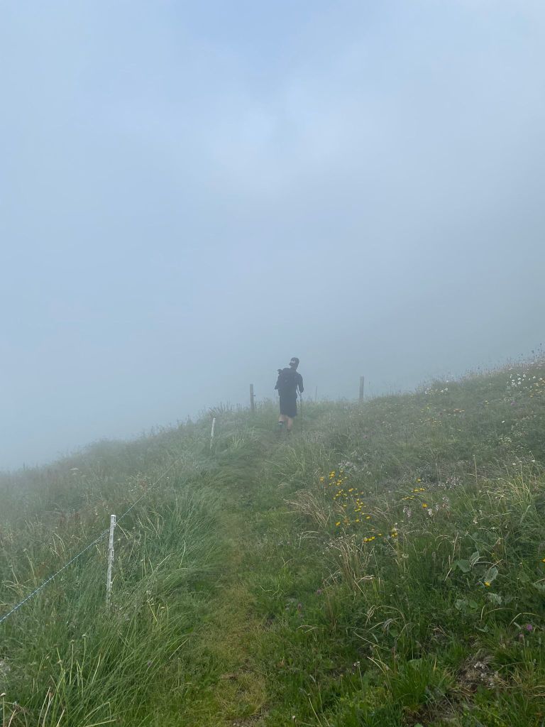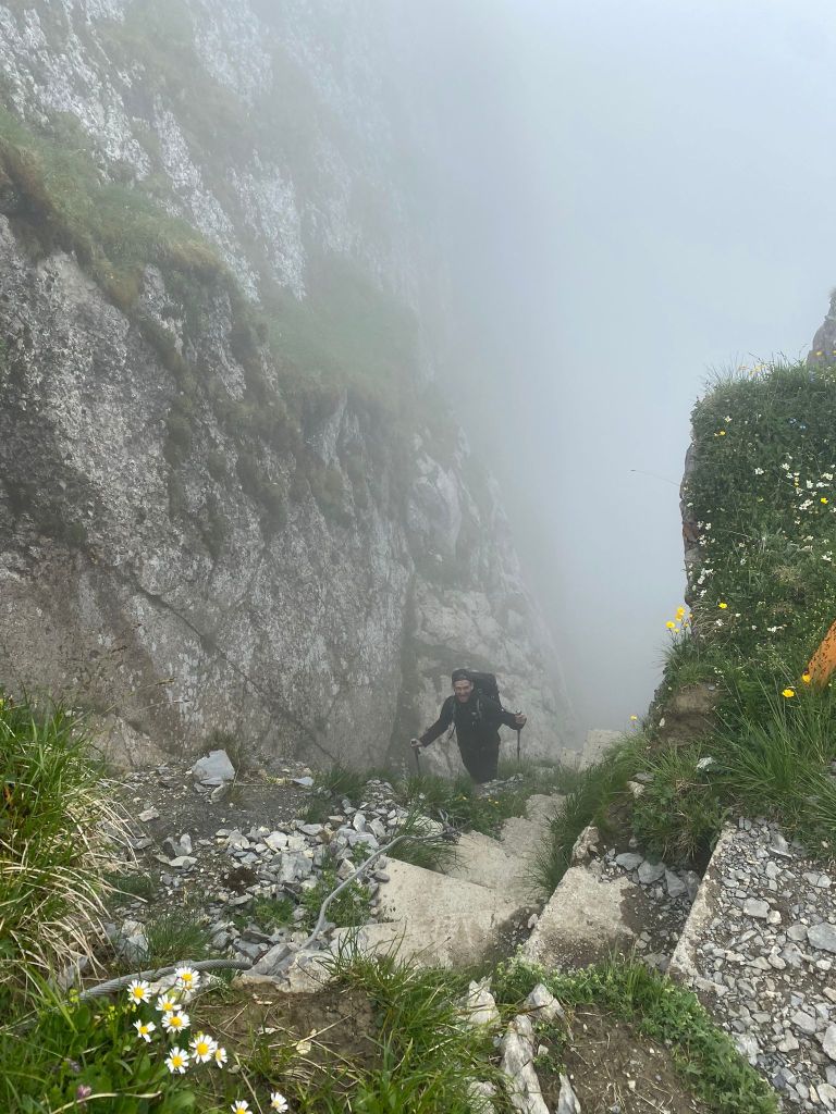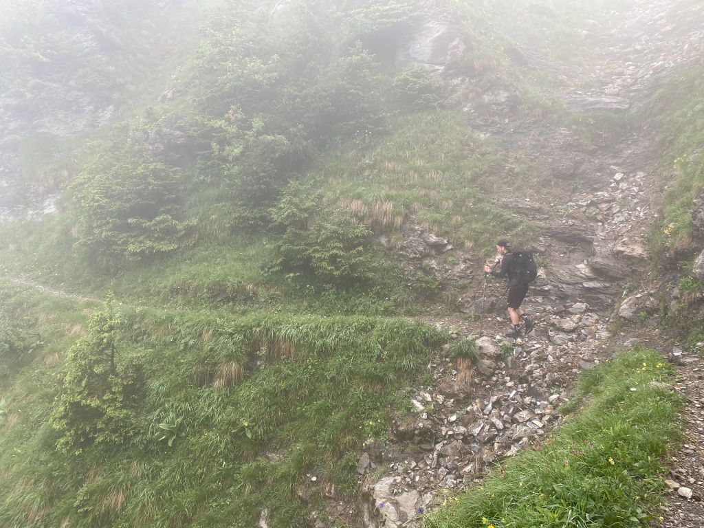 Nachdem wir dann fleissig Kilometer auf diesen herrlichen Wegen zurückgelegt hatten, stand uns mal wieder ein Aufstieg bevor. Wir waren aber ganz gut im Schwung und so stellte auch der nächste Aufstieg mit Start ab ca. 1800 m.ü.M kein grosses Problem für uns dar. Während dieser Phase bewegten wir uns grösstenteils im dichten Nebel und konnten uns somit vollumfänglich auf unsere Schritte konzentrieren. Der Boden war übrigens nicht mehr so rutschig wie noch am Vortag und so hatten wir beim Aufstieg keine Probleme, festen Halt zu finden.