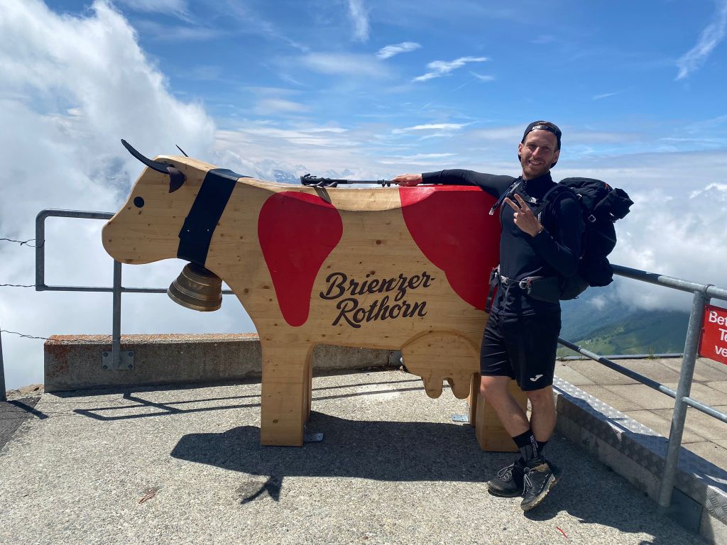 Okay noch ein kurzer Einschub, bevor wir uns auf den letzten Abstieg begeben. Und zwar müssen wir so ehrlich sein, dass wir auch das eine oder andere Touristenfoto geschossen haben. Man betrachte Fourchi neben der klassischen Trauffer Kuh und Haude mit dem Hogwarts Express im Hintergrund (in Wirklichkeit ist es natürlich die Brienzer Rothorn Bahn – andernfalls hätten wir unsere Wanderstöcke schon längst gegen Zauberstäbe eingetauscht).