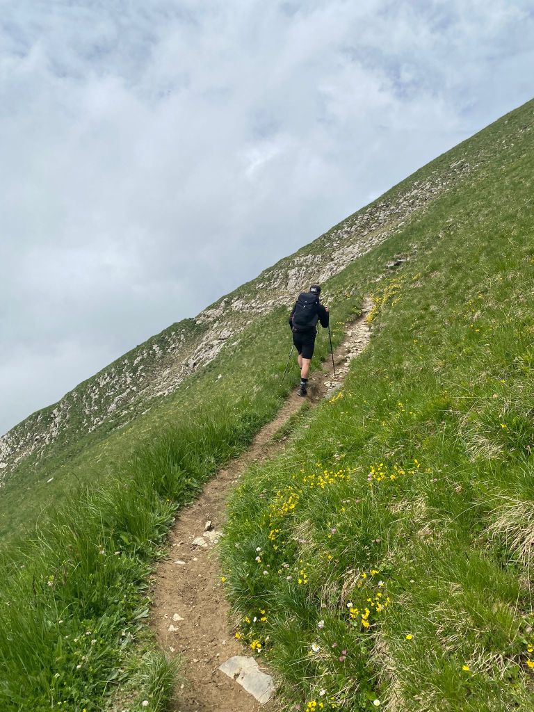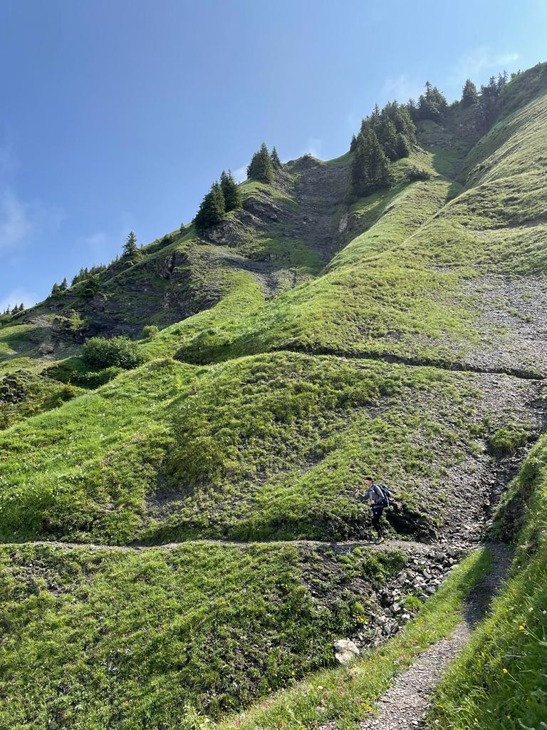 Nach dieser kurzen Pause wollten wir auch noch die letzten paar Höhenmeter in Angriff nehmen. Kurz nachdem wir wieder losgelaufen sind, kamen uns dann tatsächlich die ersten Wanderinnen und Wanderer entgegen. Da kam es dann prompt auch zu einem kurzen Gespräch, wo wir vor unserem bevorstehenden Zieleinmarsch berichteten. Und da bekamen wir ein Kompliment, das uns besonders gut schmeckte: „Ihr gsänd aber gar ned so kabutt us“. Was will man anderes hören, wenn man schon fünf intensive Tage hinter sich hat und drei Stunden Aufstieg am aktuellen Tag? Haude und Fourchi waren sichtlich zufrieden und stiegen immer weiter und weiter. Auch Schneefelder konnten sie nicht stoppen.