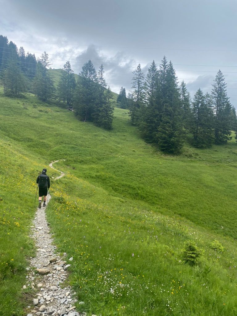 Wirklich von 0 auf 100, ohne Schonfrist, ging es schon mal ganz schön steil bergauf. Zunächst über breite Schotterwege, dann auch immer wieder durch schöne kleine Waldpassagen und das Ganze immer schön im Zick-Zack. So konnten wir gleich zu Beginn auch noch zwei weitere Wanderer hinter uns erkennen – wir befürchteten ein Überholmanöver. Aber es ist dann anders gekommen. Mit unserer gleichbleibenden, vergleichsweise hohen Pace legten wir den ersten Kilometer rasch zurück und distanzierten auch die bedrohlichen Wanderer. Nachdem wir dann etwas über 30 Minuten ausschliesslich bergauf gestiegen sind, auch wieder teilweise durch hohe, nasse Gräser hindurch, waren folgende Dinge nass: Unsere Schuhe, unsere Rucksäcke und wir selber. Dann folgte ein kleines Stück über fast gerade Flächen.