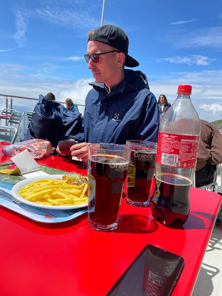 Das Restaurant war zwar schon gut besucht, aber wir fanden problemlos einen grossen 6er-Tisch draussen an der Sonne, wo wir uns dann zufrieden hinsetzten. Haude holte im Restaurant eine Portion Pommes-Frites mit Chicken-Nuggets sowie eine 1.5l Flasche Coca Cola. Wir haben das wirklich fast hälftig unter uns aufgeteilt – irgendwie war der Appetit nach dem letzten Aufstieg doch wieder etwas grösser als auch schon in den vergangenen Tagen.