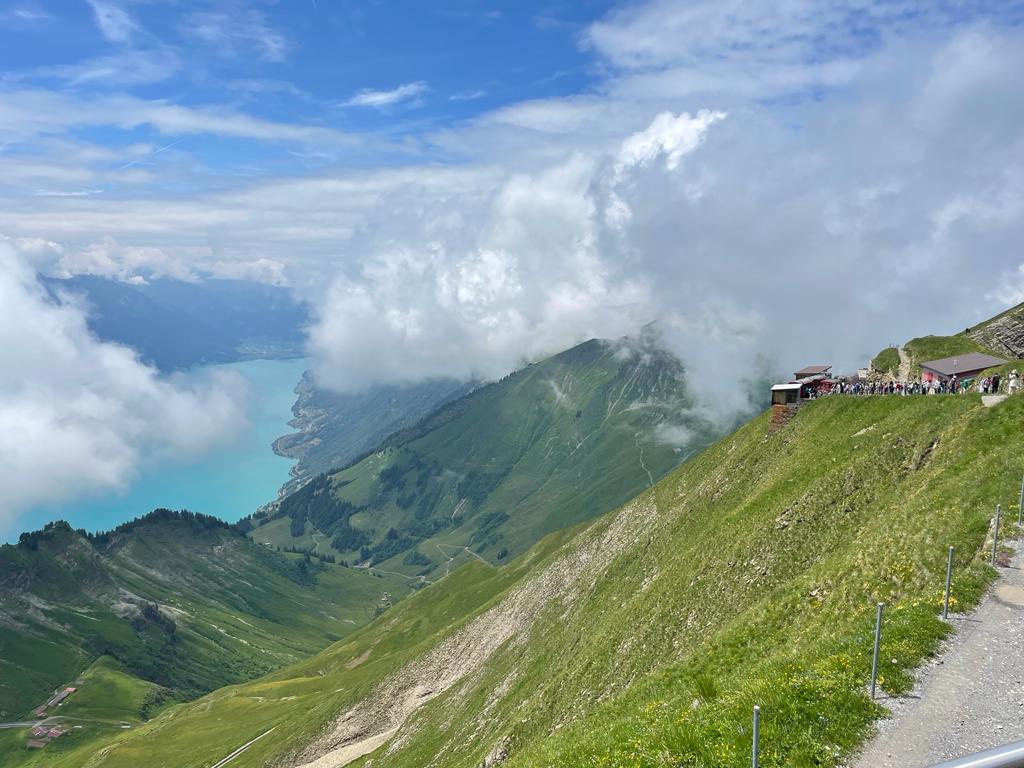 In der Zwischenzeit ist dann auch noch eine Bahn aus Brienz oben angekommen und da waren wir wirklich ein wenig geschockt. So viele Leute stiegen aus und bewegten sich in Richtung Restaurant – vorbei war es mit der Ruhe und es kam fast schon ein bisschen Hektik auf. Im nachfolgenden Bild sehen wir auf der linken Seite den wunderbaren Brienzersee – das gefällt uns sehr. Auf der rechten Seite sehen wir einen Schwarm von Touristen, die nachher das Restaurant und den Gipfel stürmen werden – das gefällt uns nicht wirklich.