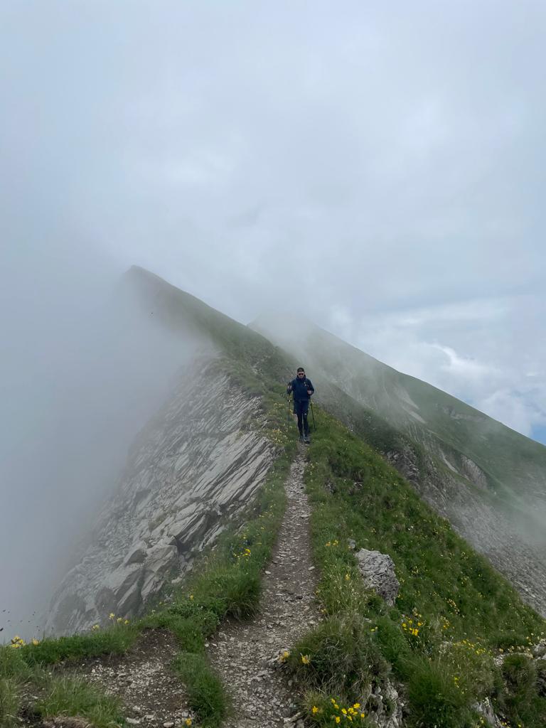 Zurück zum Abstieg in Richtung Sörenberg. Die ersten Meter legten wir auf wunderbar angelegten Wanderwegen nahe dem Grat und teilweise auch direkt über den Grat zurück. Das Wetter wurde in dieser Phase immer schlechter und schon bald waren die Sonnenstunden gezählt und wir mussten uns fortan durch den Nebel kämpfen. Zudem durfte Haude auf der heutigen Tour eher unerwartet nochmals gegen seine Höhenangst ankämpfen, als plötzlich ein relativ schmaler Grat bevorstand – nicht allzu lange aber doch nicht ohne für Nicht-Schwindelfreie.