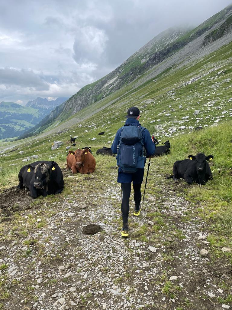 Haude war übrigens mit seiner Nebelbrille unterwegs, um im Nebel besser sehen zu können. Ihr habt davon noch nie gehört? Wir auch nicht – Haude wollte einfach noch etwas scharf sehen (er hatte ja die Linsen vergessen) und da setzte er nach der Mittagspause einfach seine korrigierte Sonnenbrille auf. So langsam aber sicher kämpften wir uns immer mehr der Rossweid entgegen und es gibt auch wirklich da nichts mehr gross zu berichten. Es kamen nach dem langen steilen Abstieg flächere Passagen und wir hatten sogar noch das grosse Vergnügen, dass die Kühe für uns Spalier lagen. Bisher lagen oder standen sie uns ja häufig im Weg, heute bereiteten sie uns quasi den Weg.