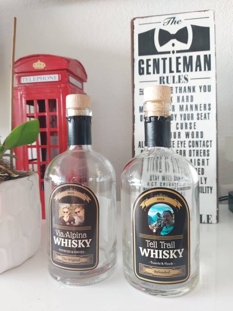 Und natürlich haben wir auch wie gestern schon geschrieben den Tell Trail Whisky geleert und Haude hat die Flasche wie schon letztes Jahr auch wieder bis nach Hause getragen. Leider ging ein Glas zu Bruche, aber lieber ein Glas, als die Flasche. Es war auch schon ganz klar, wo diese Flasche hingestellt würde – in nächster Nähe zum Via Alpina Whisky in der Hall of Fame. Da kommt die Frage auf, was wohl auf der nächsten Whisky Flasche stehen wird…? Lassen wir so stehen.