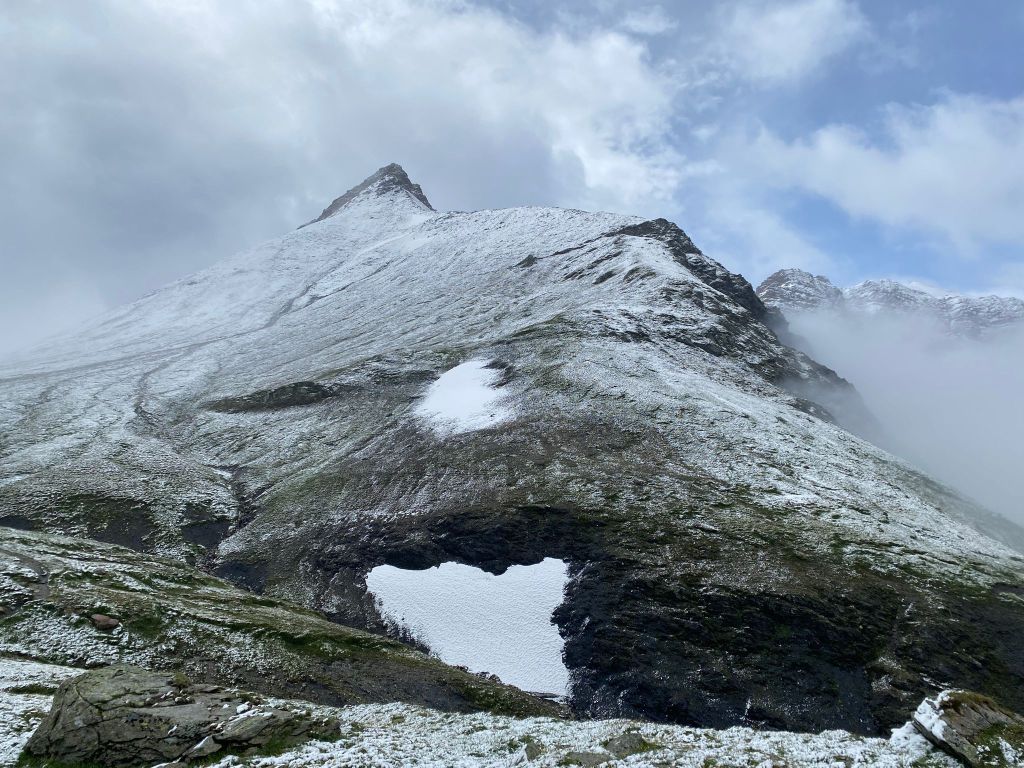 Kurze Zeit später erreichten wir also den Passübergang Diesrut auf 2428 m. ü. M. Glücklicherweise waren die Wanderwege weiterhin fast schneefrei und so fanden wir uns tiptop zurecht – zumindest am Anfang noch. Zuerst stand aber noch das Passfoto an und Fourchi präsentierte dafür seine beste Skihocke.
