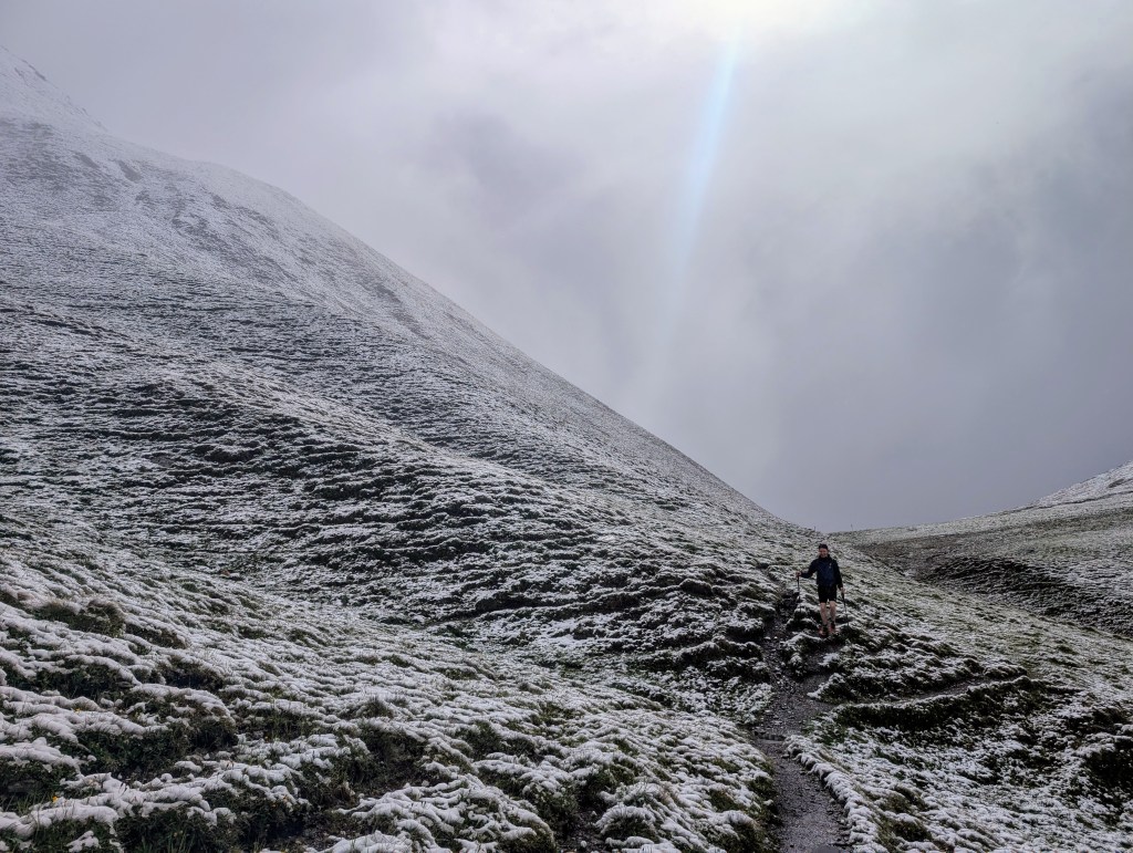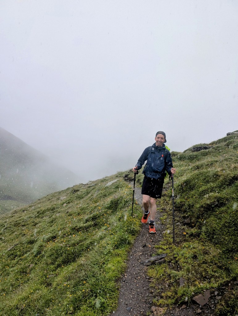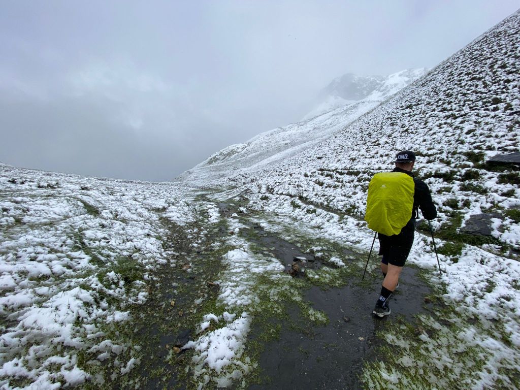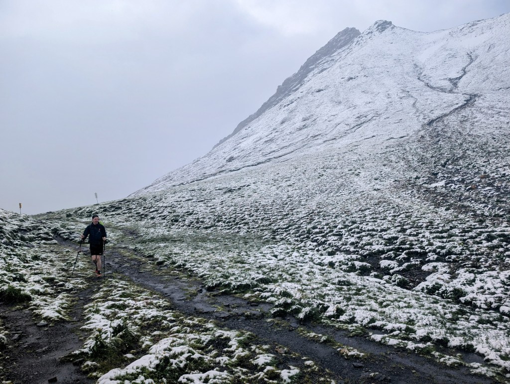 Und wir hätten definitiv keinen besseren Zeitpunkt für die Pause wählen können, weil anschliessend wurde es ungemütlich. Wir vermuten ja, dass Petrus ebenfalls Fan unseres Blogs ist und deshalb stets innerhalb seines Einflussgebiets dafür sorgt, dass auch immer etwas Interessantes passiert. Und so sahen wir uns schon bald mit Schneefall konfrontiert – ein Novum für uns beide. Dieser war teils ziemlich heftig und in Kombination mit dem frischen Wind nicht sonderlich angenehm. Aber Haude konnte immer noch lachen…