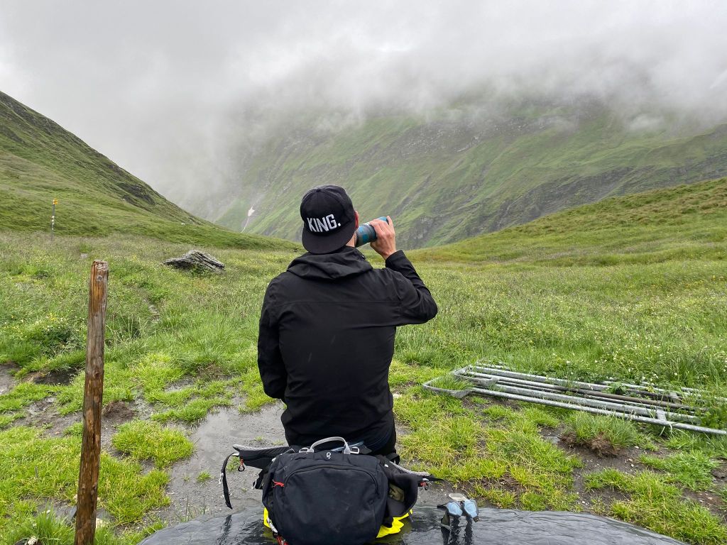 Nach nicht einmal fünf Stunden Laufzeit sind wir bei der Capanna Scaletta angekommen und hatten somit nach 19 Kilometern unser erstes Tagesziel erreicht. Wir nahmen den zusätzlichen Abstieg zur Hütte gerne in Kauf und haben uns nach einem speziellen Ankunftsfoto im Inneren der Hütte kurz aufgewärmt. Haude hat noch ein Cola und einen Eistee spendiert. Als diese Getränke verschlungen waren, ging es auch schon wieder weiter – wir hatten ja noch 15 weitere Kilometer vor uns.