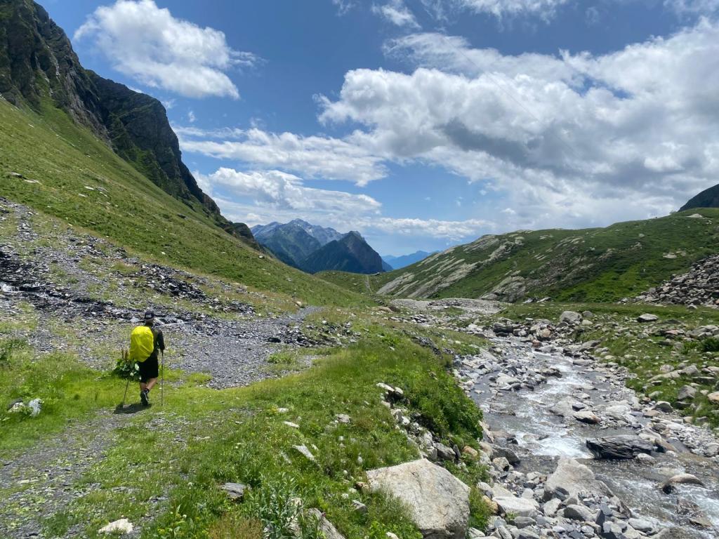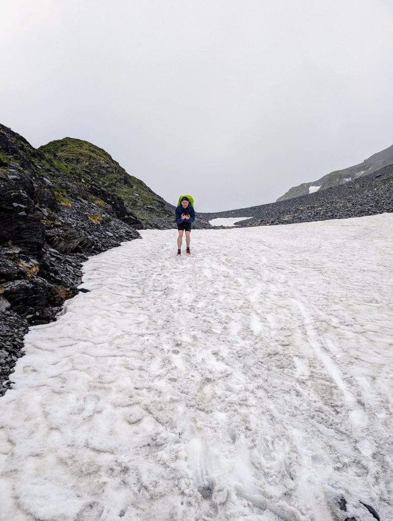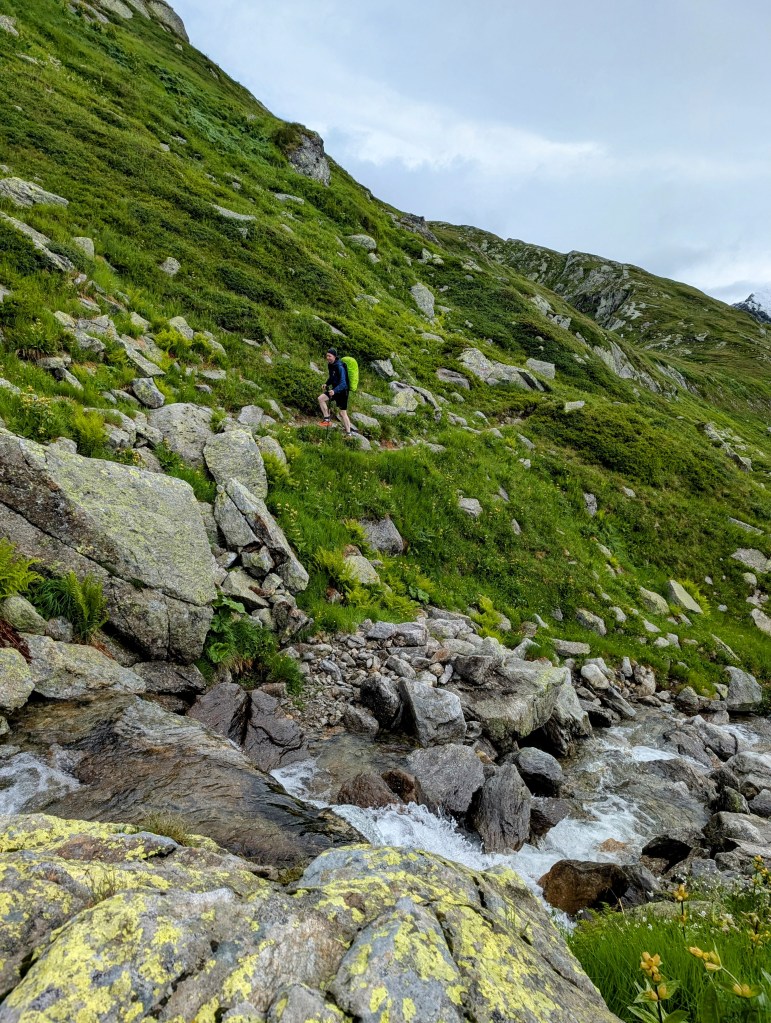 Wir waren mittlerweile am Ende der Greina Hochebene angekommen und es folgte nun noch ein längerer, aber ziemlich flacher Abstieg in Richtung Capanna Scaletta. Dabei stiessen wir doch tatsächlich noch auf ein Schneefeld, welches wir durchqueren mussten. Für uns natürlich ein Klacks und absolut problemlos begehbar.
