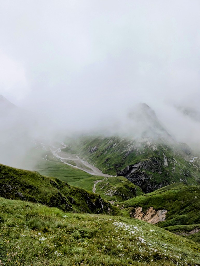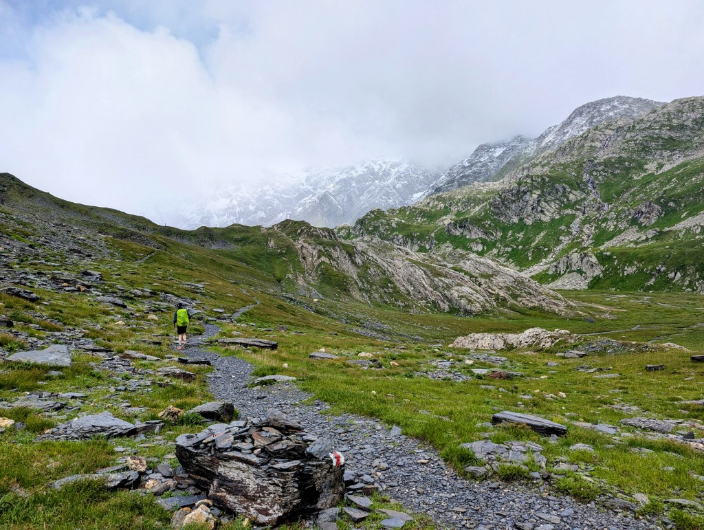 Wir hatten also den Anfang der Greina Hochebene erreicht, leider nicht ganz bei dem Wetter, welches wid uns gewünscht hätten. Anderseits werden wohl nur wenige die Gelegenheit haben, die Greina Hochebene bei diesen Bedingungen im Juli zu begehen. Und so machten wir das Beste daraus, kamen ein weiteres Mal kurzzeitig vom Weg ab, um dann über schneebedeckte und rutschige Wiesen abwärts wieder auf den Wanderweg zu gelangen.