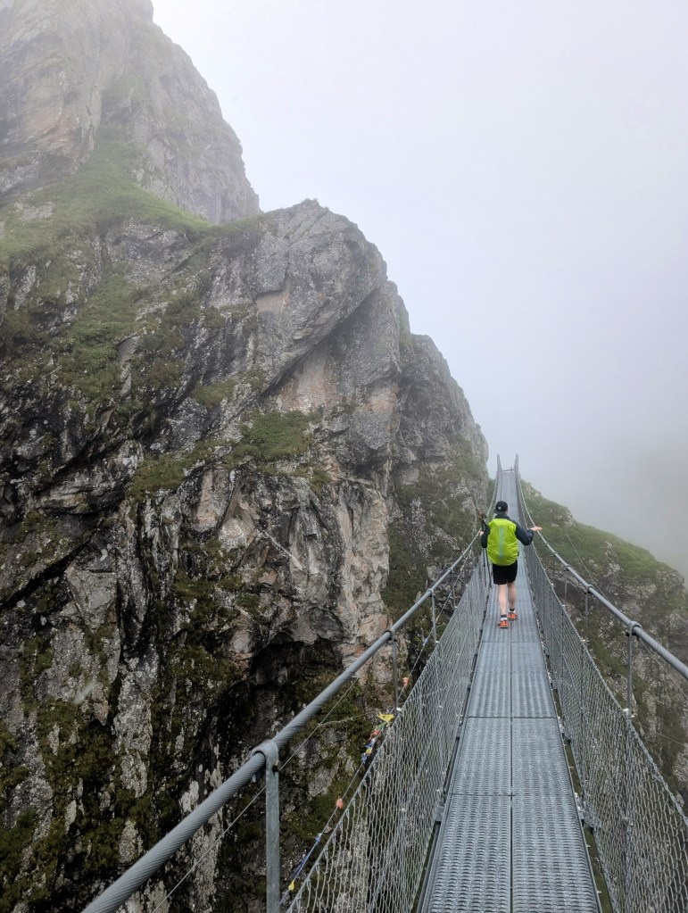 Es dauerte nicht lange und der Schnee schwappte in Regen über und so setzte sich unser Abstieg fort. Schon bald erblickten wir eine Hängebrücke und die Terri-Hütte. Haude ist jetzt nicht ein riesiger Fan von Hängebrücken, aber er wusste, dass er durch muss.