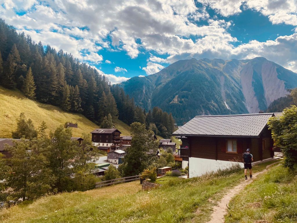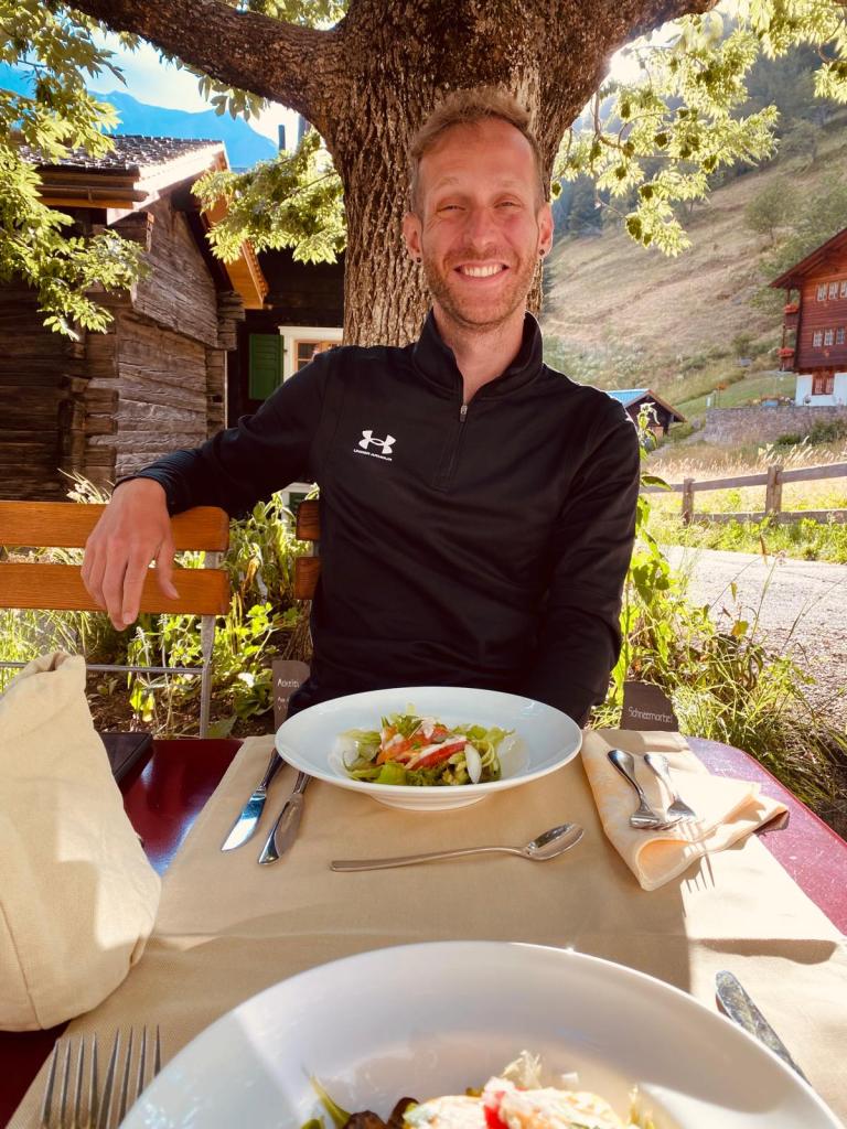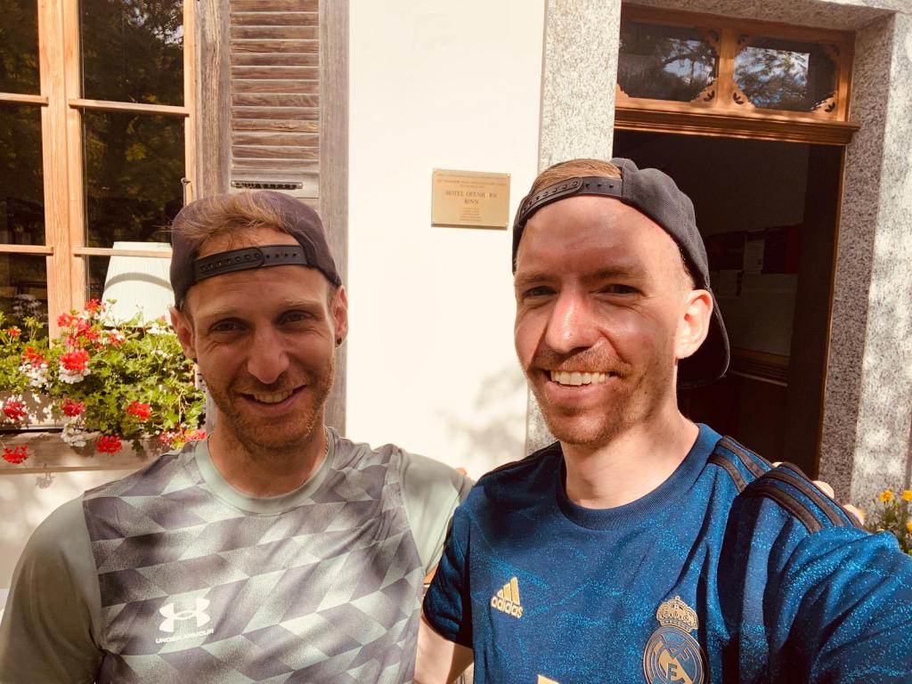 Von da aus waren es nur noch wenige Meter zu unserer Unterkunft Hotel Ofenhorn. Wir hatten es also tatsächlich geschafft. In den letzten sechs Tagen haben wir uns gemeinsam von Splügen über 190 Kilometer und über fast 12’000 Höhenmeter (je auf- und abwärts) bis nach Binn durchgekämpft. Und nun waren wir also da – ein unbeschreibliches Gefühl. Wir legten zuerst unsere Rucksäcke ab und schossen ein Foto, um unseren Liebsten zu zeigen, dass wir (mehr oder weniger) wohlbehalten in Binn angekommen sind.