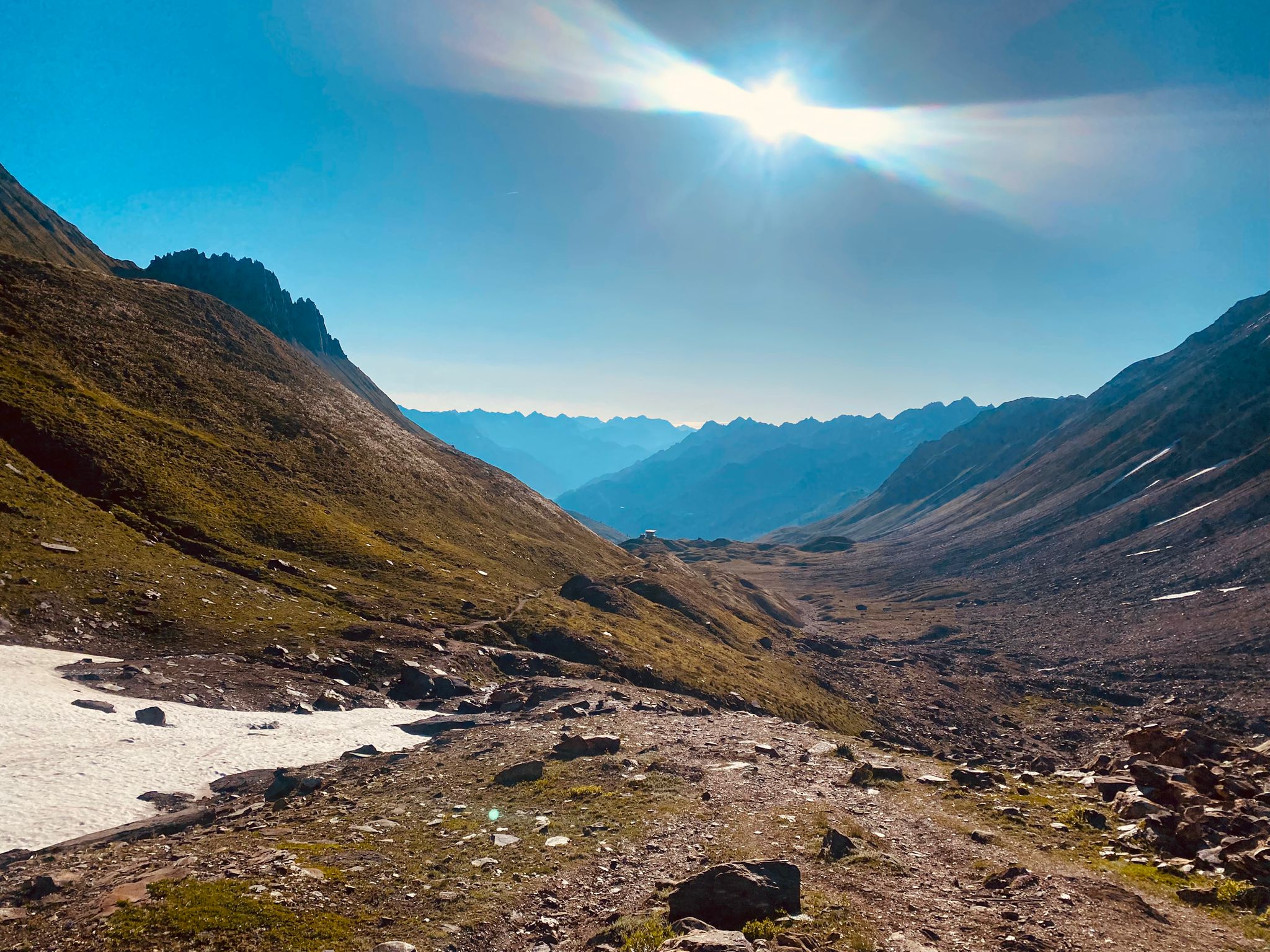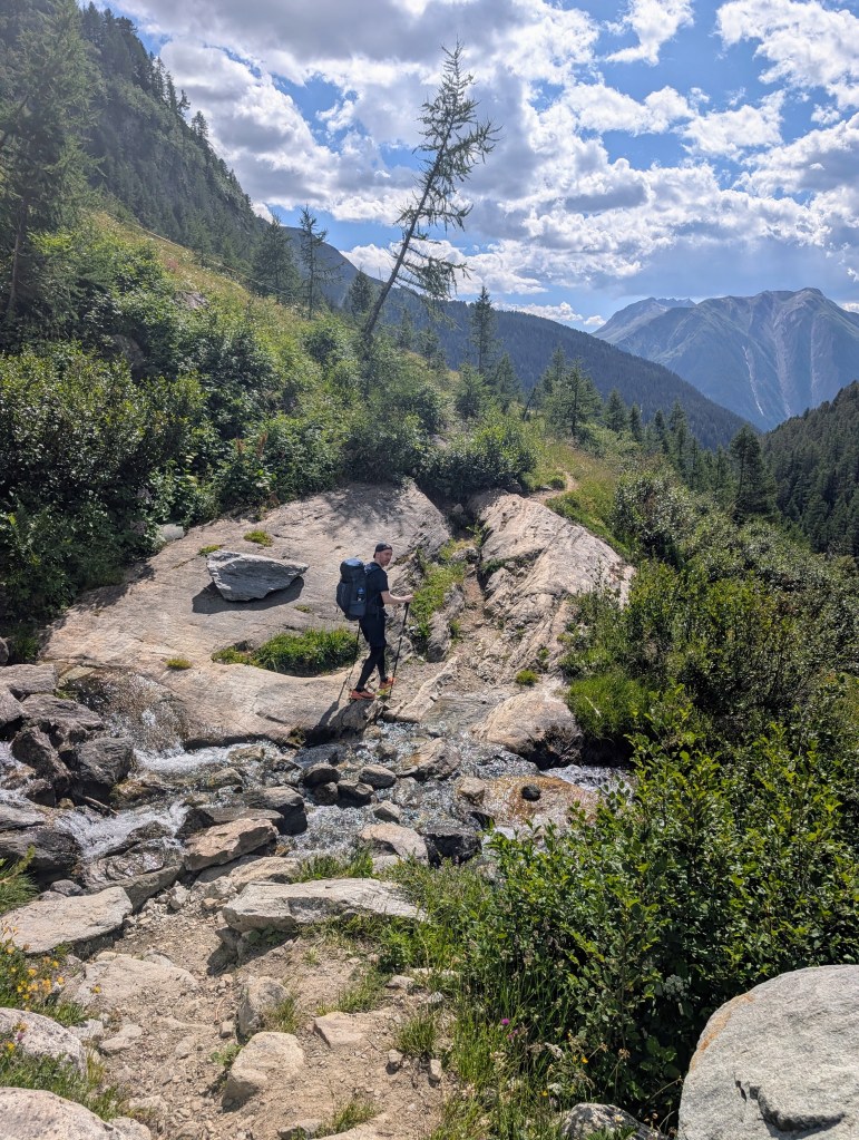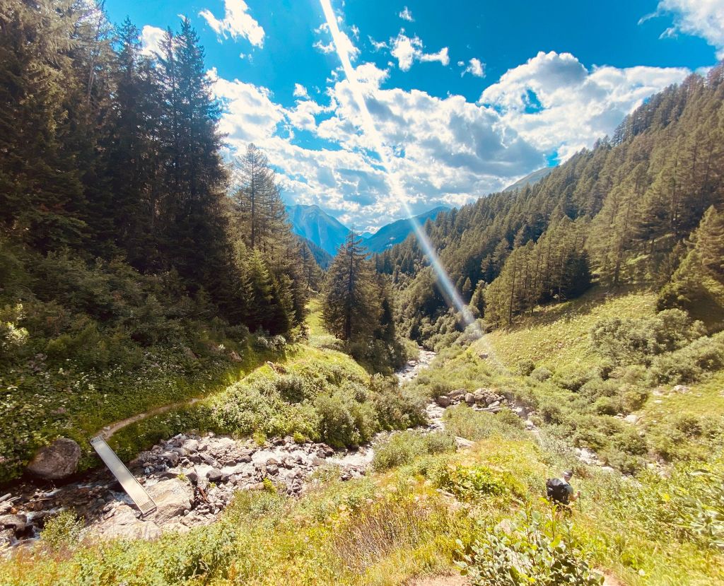 Die ersten paar Kilometer des Abstiegs gingen noch relativ gut und wir kämpften uns mit den uns noch zur Verfügung stehenden Mitteln durch. Wir zogen auch noch an einer weiteren SAC-Hütte (Binntal-Hütte) vorbei, bevor es immer weiter runterging. Der Abstieg war eigentlich ganz angenehm, nicht allzu steil und gutes Gelände. Aber unsere Körper waren schon sehr träge und konnten selbst diesen Abstieg nicht mehr sonderlich gut verdauen.