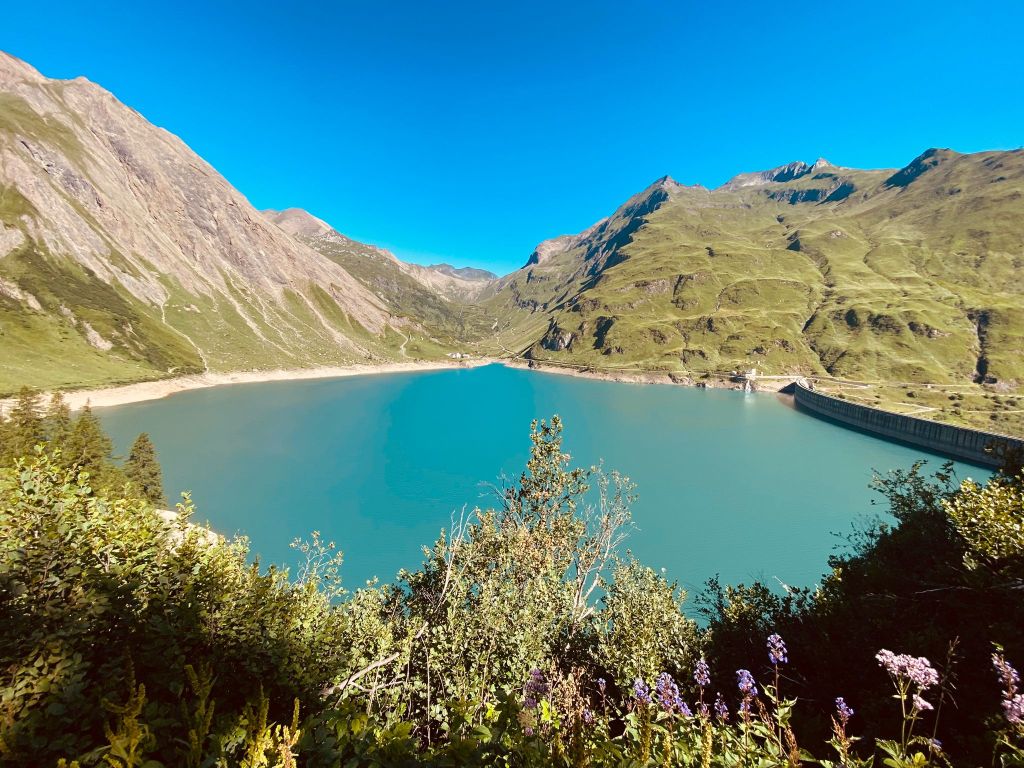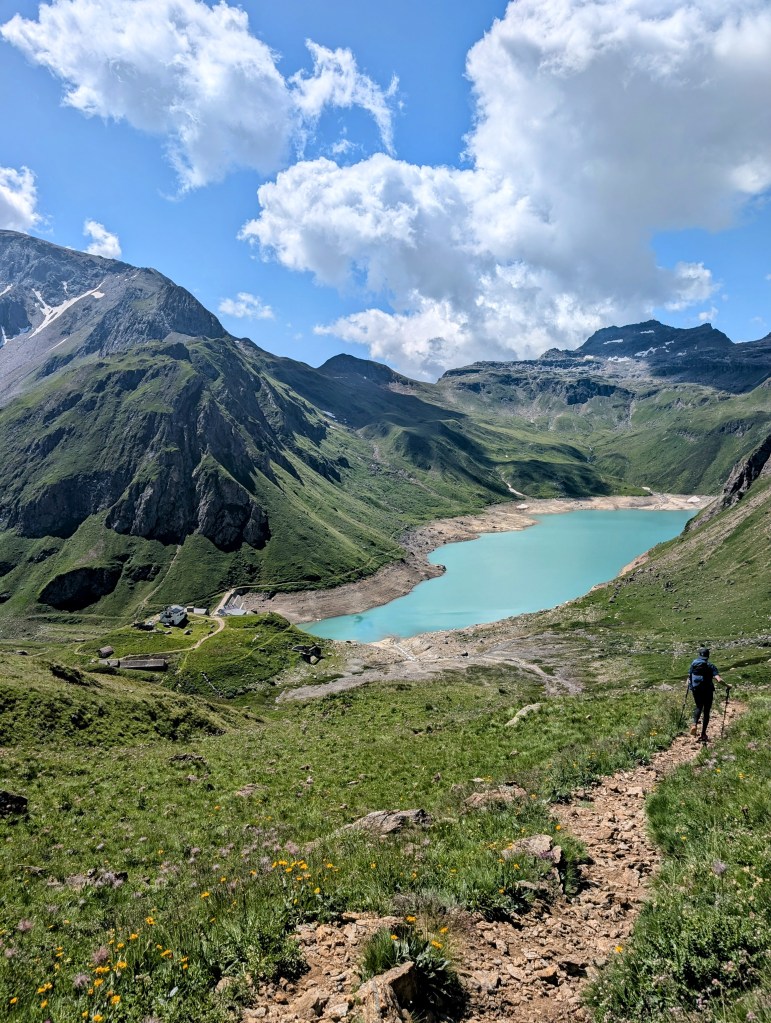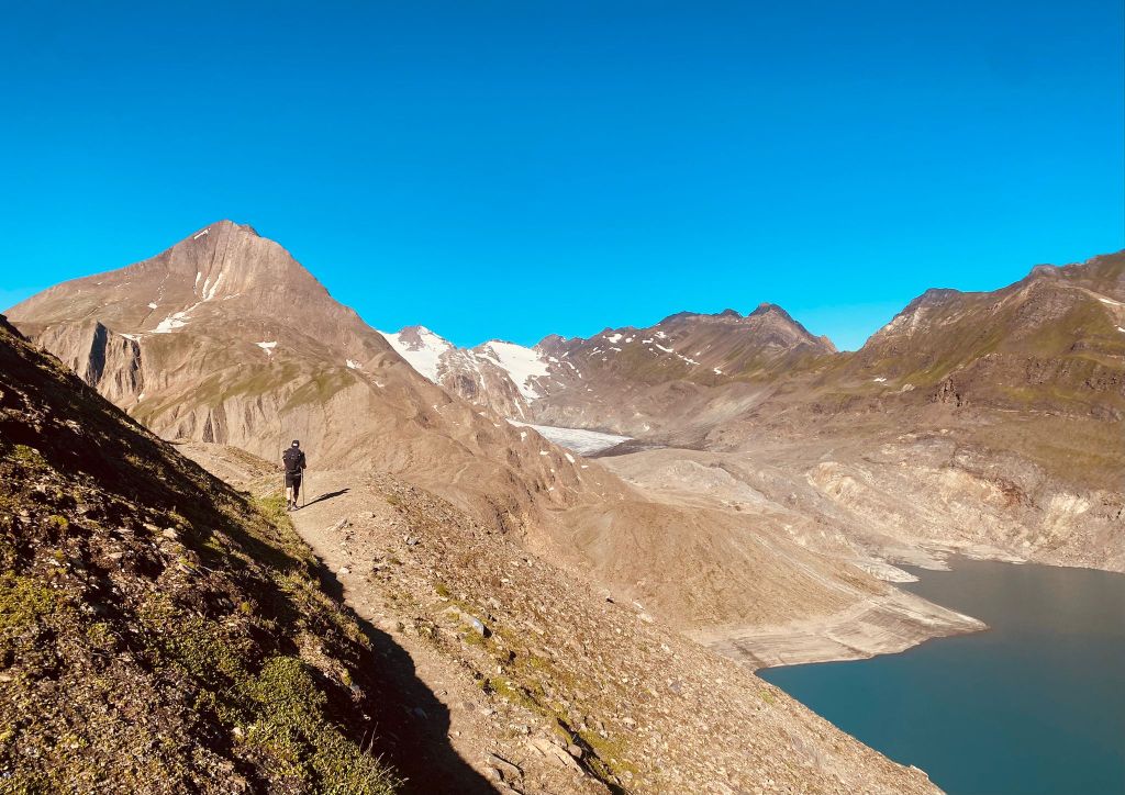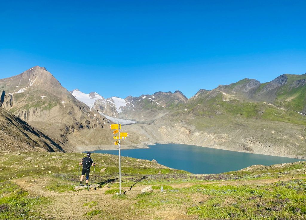 Nun stand uns auch schon bald der Stausee Lago di Morasco in voller Pracht vor uns. Hier mussten wir auch ein erstes Mal unsere SchweizMobil App konsultieren, weil die Route im App einen anderen Weg zeigte, als tatsächlich mit dem Wegweiser der Route 6 signalisiert wurde. Wir entschieden uns, dem Wegweiser zu folgen und umrundeten somit den Stausee auf der anderen Seite, was vermutlich ein paar zusätzliche Meter zur Folge hatte – zu diesem Zeitpunkt stellte das für uns noch kein Problem dar, weil wir fühlten uns noch frisch und kamen mit gutem Schritt voran.