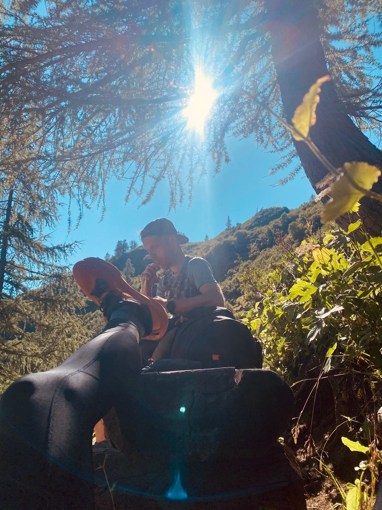 An dieser Stelle, mit diesem Ausblick, legten wir unsere erste Pause am heutigen Tag ein. Mittlerweile waren wir seit 02.15 Stunden unterwegs und wir wussten, dass nun in den nächsten vier Kilometer ein Aufstieg über rund 800 Höhenmeter bevorstand. Also hiess es für Fourchi nochmals, die letzte Gummischlange verdrücken, und für Haude, die Beine hochlagern und das Schienbein nochmals nachschmieren.