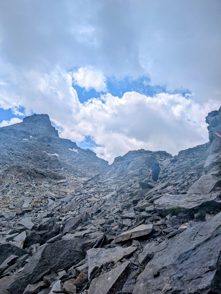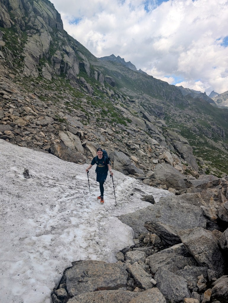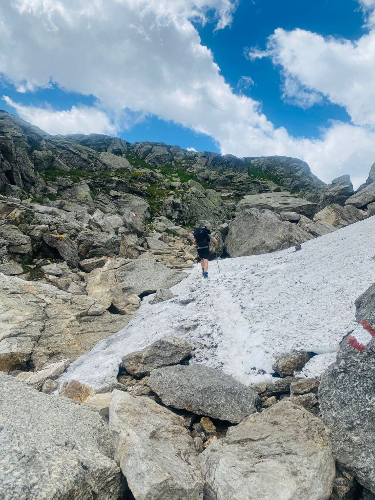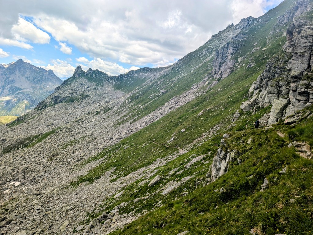 Es waren immer noch 14 Kilometer zurückzulegen, und uns stand jetzt wirklich noch der letzte längere Aufstieg bevor. Und zwar wollten wir wieder zurück in die Schweiz uns hierfür mussten wir noch den Albrunpass bewältigen. Also hiess es heute zum vierten Mal: Tempo finden und dann alle in einem Zug hochziehen. Aber auch hier war nochmals grosse Konzentration erforderlich, weil wir insbesondere den letzten Teil in riesigen Geröllhalden erklimmen mussten. Und dann durften wir heute noch ein kleines Schneefeld passieren.