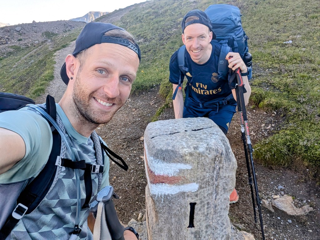 Auf der anderen Seite waren noch ein paar sehr grosse Windräder zu sehen, scheinbar die Windräder des höchsten Windparks Europas. Und nachdem wir auch das geklärt hatten, ging es auch schon weiter in Richtung Italien. Wir erreichten ein paar Kilometer weiter den Grenzstein und posierten da natürlich für ein kurzes Foto – Haude befindet sich noch in der Schweiz und Fourchi ist schon in Italien.