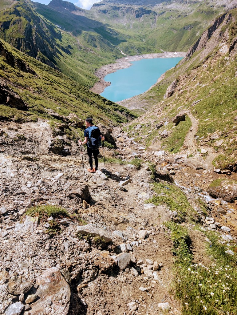 Danach ging es auch schon weiter mit dem nächsten steilen Abstieg in Richtung Rifugio Margaroli, wo unsere erste Etappe zu Ende gehen würde. Praktisch von Beginn an hatten wir dabei einen herrlichen Blick auf den dritten See des Tages: Lago Vannino. Man könnte also fast auch sagen, dass diese erste Etappe von der Capanna Corno-Gries nach Rifugio Margaroli eine Drei-Seen-Wanderung ist – wirklich wunderschön.